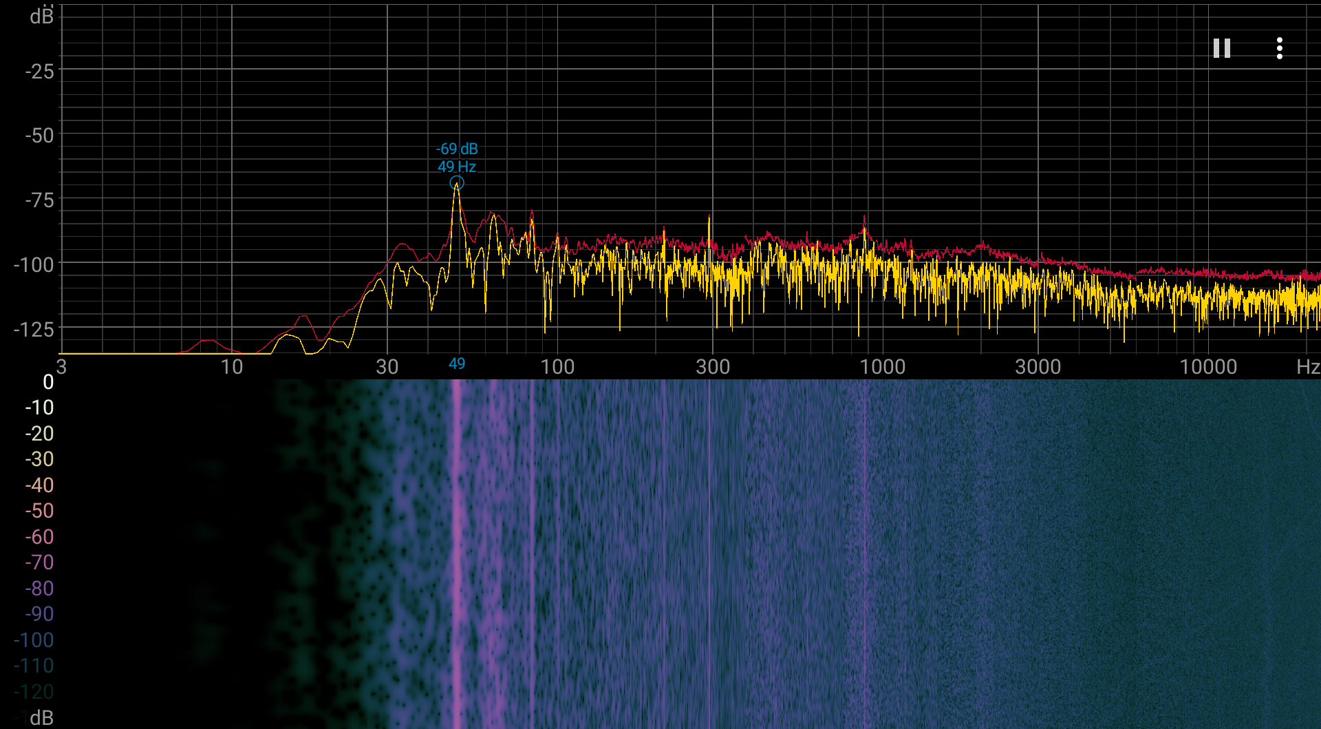 В целом Irbis IMFPC107 не является шумным устройством. Характер шума ровный и раздражения не вызывает. Спектрограмма, полученная под максимальной нагрузкой на процессор и видеокарту, достаточно ровная, и в диапазоне частот, где звуки могут вызывать особенное раздражение, пиков с высокой интенсивностью нет (низкочастотными пиками можно пренебречь):