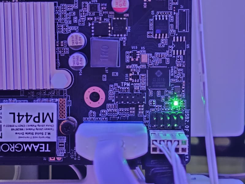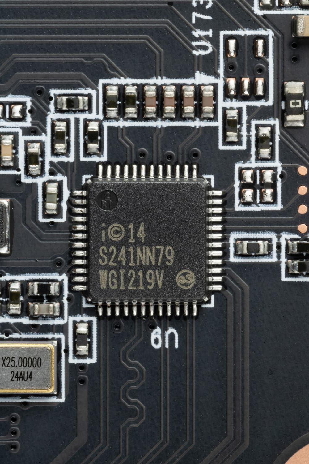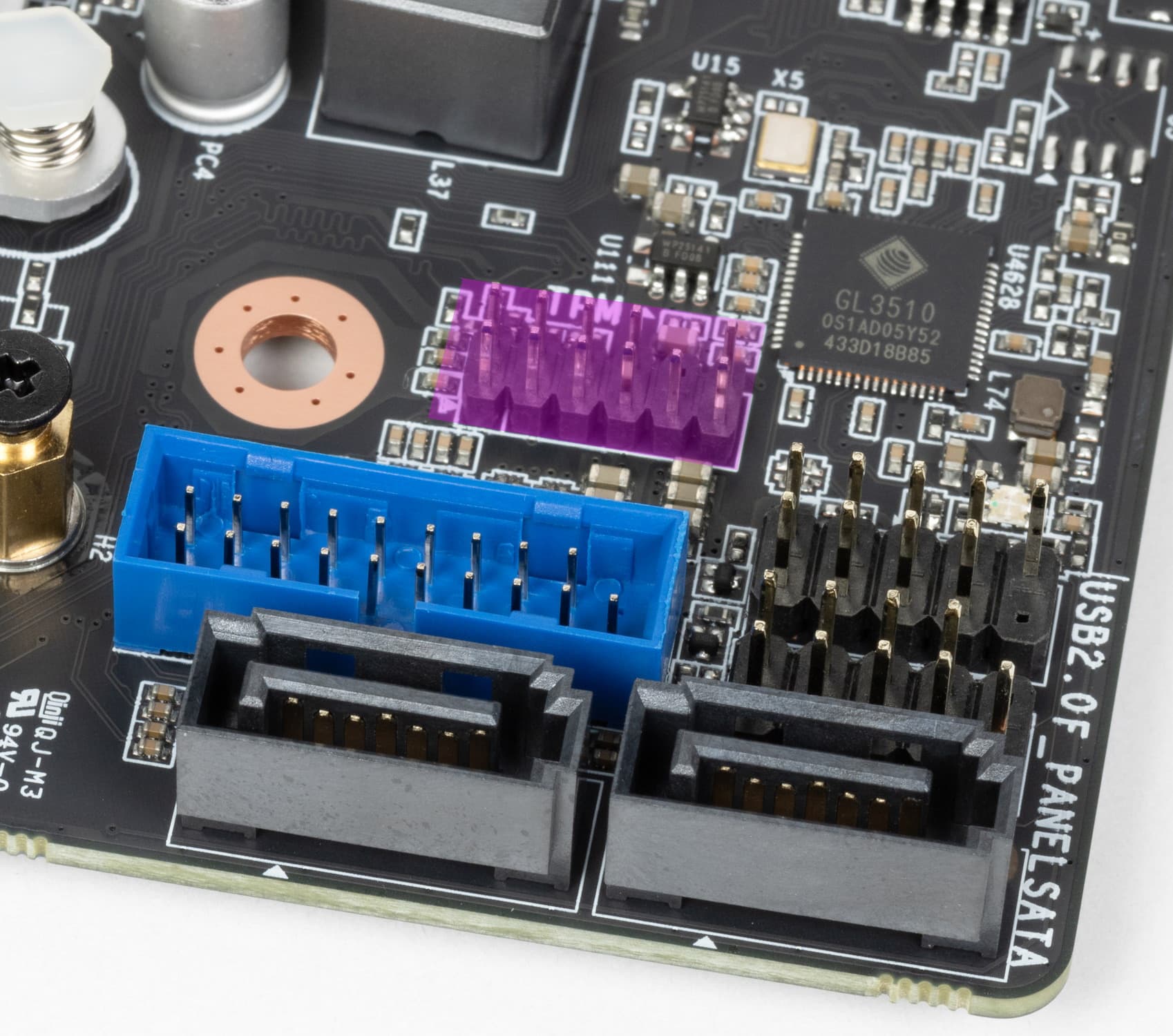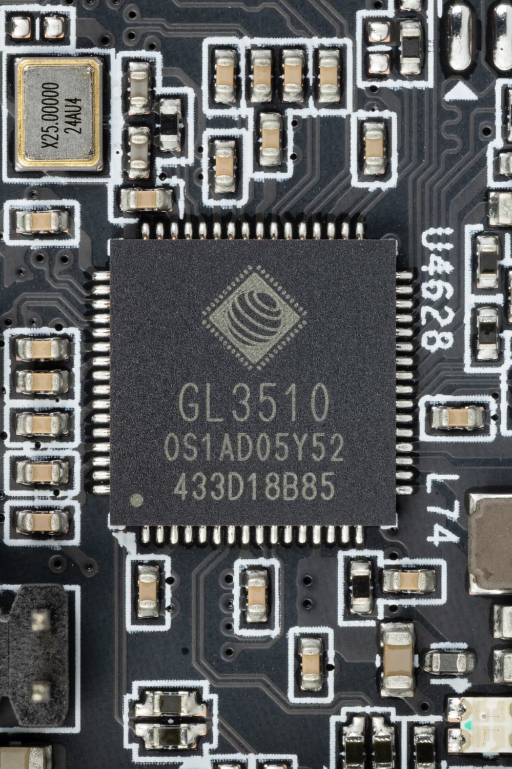 - 4 порта USB 3.2 Gen1: 2 реализованы через хаб Genesys Logic GL3510 (на него потрачена 1 линия USB 2.0 от H610) и представлены внутренним разъемом на материнской плате на 2 порта; еще два реализованы через H610 и представлены на задней панели 2 портами Type-A (синего цвета);