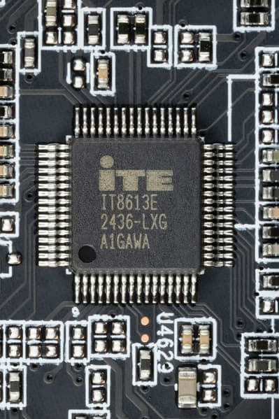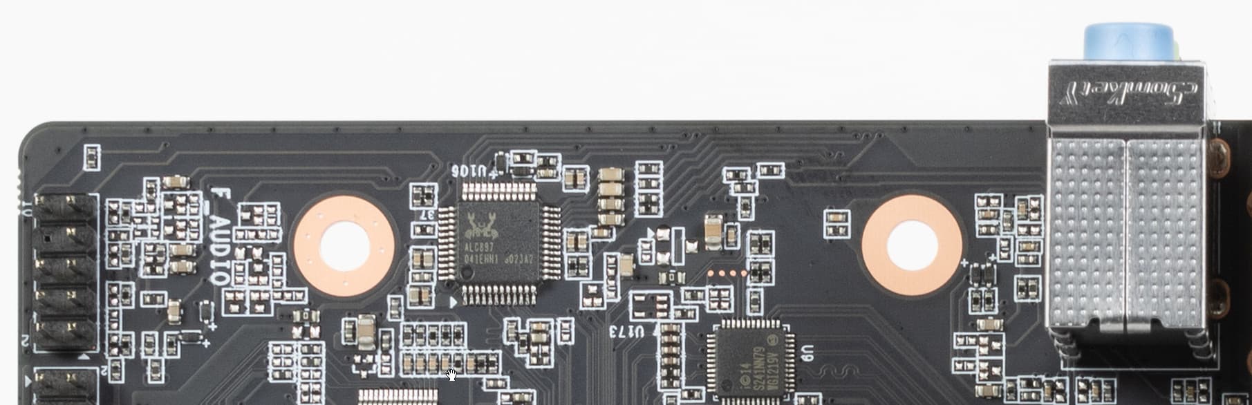 Аудиоподсистема весьма проста: нет ни операционных усилителей, ни ЦАП, и даже нет «аудиофильских» конденсаторов, что является логичным: плата относится к очень бюджетным решениям.