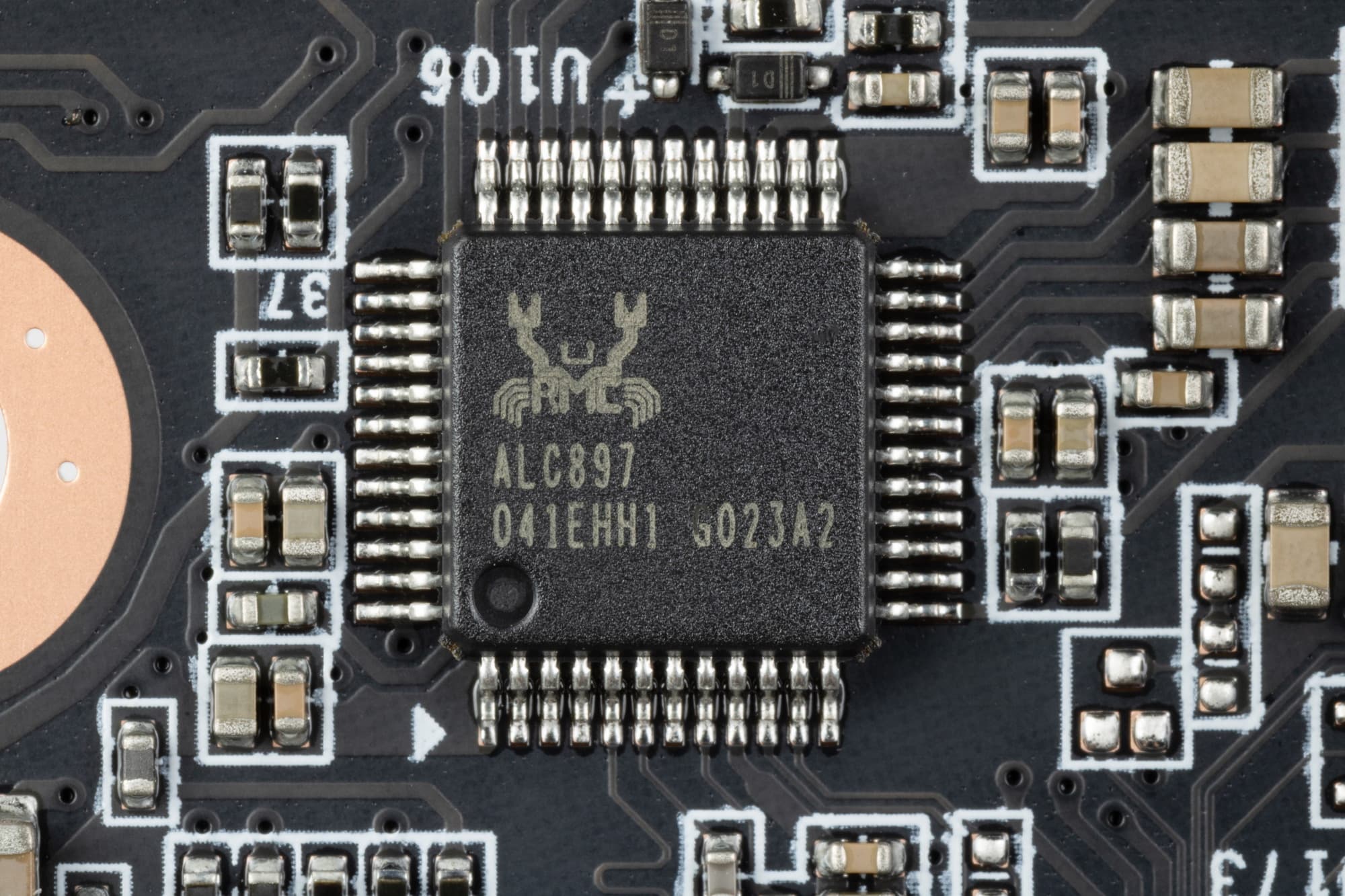 Мы знаем, что почти во всех современных материнских платах звуковым кодеком является продукт от Realtek, обеспечивающий вывод звука по схемам до 7.1, в последнее время это стал ALC4080 с характеристиками 32 бит / 384 кГц. Однако в данном случае применен очень старый Realtek ALC897 и схема понижена до 5.1.