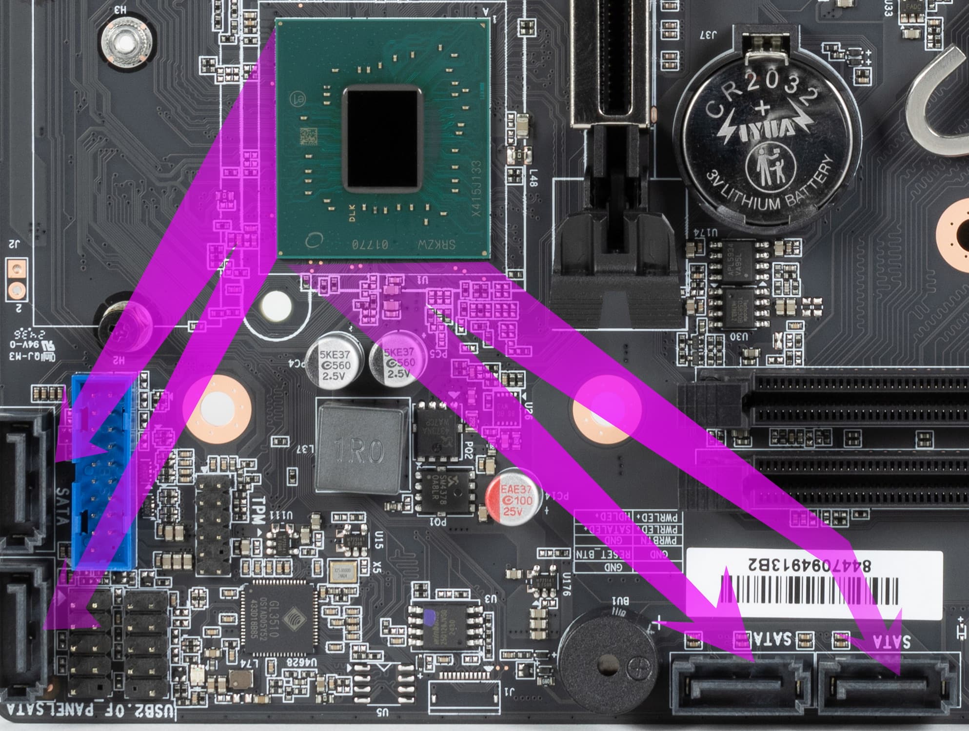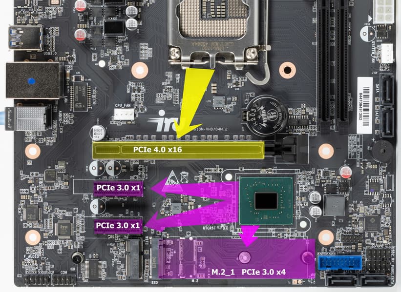 Кроме USB-портов, к которым мы подойдем позже, чипсет H610 обладает 8 PCIe линиями и 4 портами SATA. Считаем, сколько линий уходит на поддержку (связь) с тем или иным элементом (надо учитывать, что все линии версии PCIe 3.0):