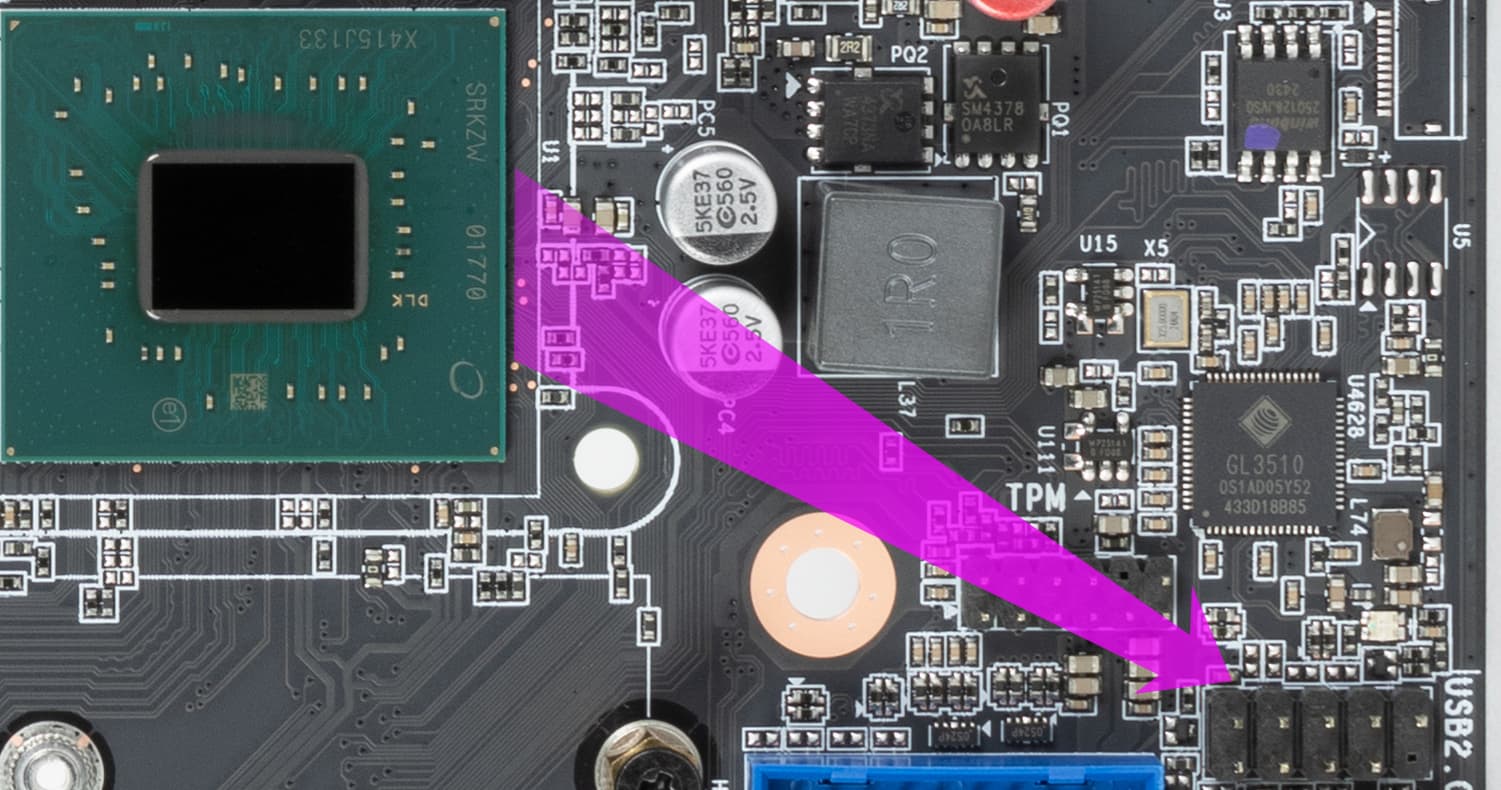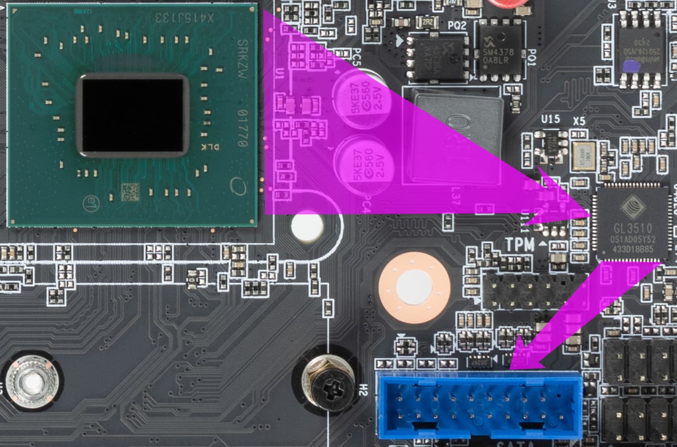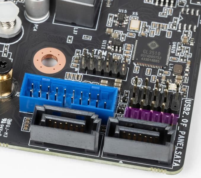 = 2 высокоскоростных порта. Не забываем, что каждый высокоскоростной порт USB обеспечен портом USB 2.0, то есть уже 2 порта USB 2.0 также занято. Плюс 6 выделенных портов USB 2.0, 1 порт USB 2.0 выделен для поддержки хаба USB 2.0 Genesys Logic GL3510 и 1 порт выделен для поддержки слота M.2 (Key E) для беспроводных соединений BT/WiFi. Всего 10 USB 2.0 портов реализовано.
