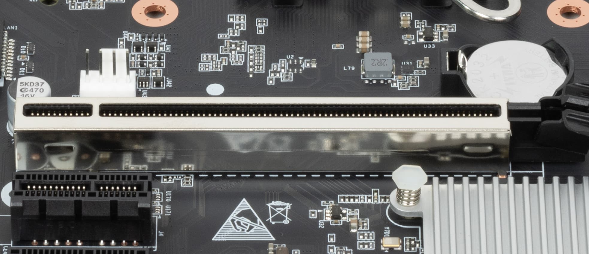 Теперь посмотрим выше на то, как работают процессоры в данной конфигурации. У CPU 12/13/14-го поколений всего 20 линий PCIe, 4 из них версии PCIe 4.0 отведены на порт М.2, но в данном случае они не реализованы. Оставшиеся 16 линий PCIe 5.0 (с понижением до версии 4.0) идут на единственный слот PCIe x16, поэтому вариантов переключений нет, как и мультиплексоров для этих целей.