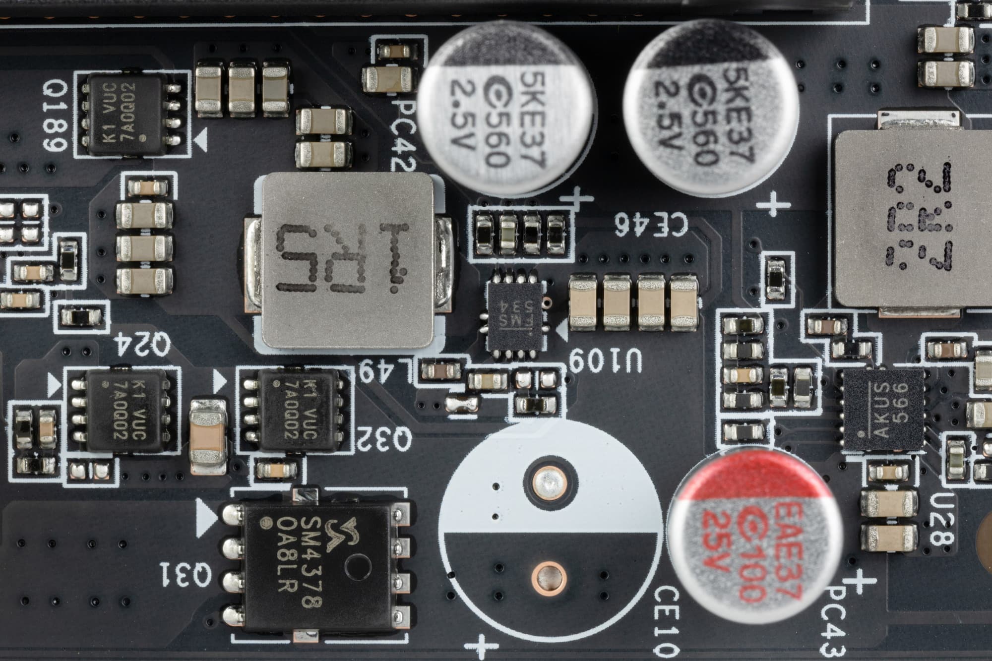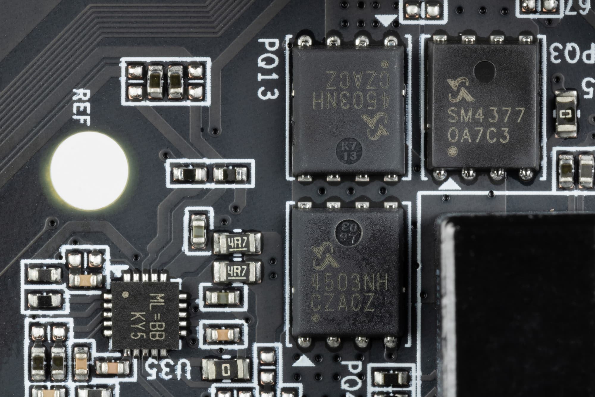 Каждый канал фазы имеет суперферритовый дроссель и набор полевых транзисторов Sinopower SM4508/4503 (60 А)