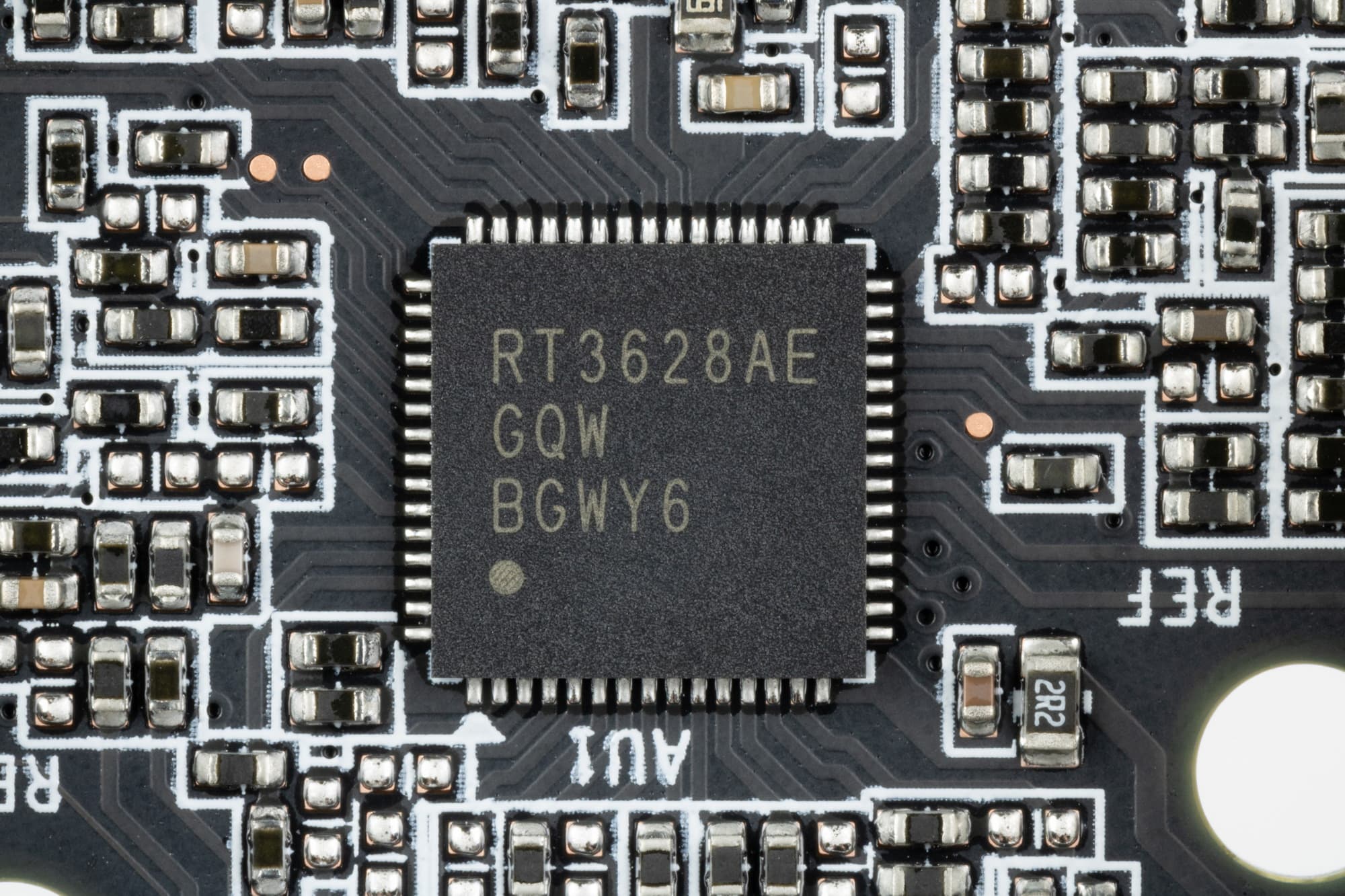 Управляет схемой питания ШИМ-контроллер RT3628 от Richtek (может обслуживать до 8 фаз).