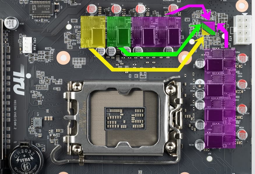 Схема питания процессора выполнена по схеме 6+1+1 (всего 8 фаз, 6 на VCore, 1 на iGPU и 1 на VCCIO).