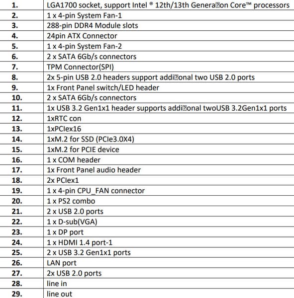 Процессоры Intel Core 12/13/14-го поколений (совместимые с сокетом LGA1700 и поддерживаемые H610) имеют 20 линий ввода-вывода (16 PCIe 5.0, 4 PCIe 4.0), не имеют USB и SATA портов. При этом взаимодействие с H610 идет по особому каналу Digital Media Interface 4.0 (DMI 4.0 x4 (именно х4!)). Все PCIe линии процессора идут на слоты расширения PCIe и порт М.2. Serial Peripheral Interface (SPI) используется для взаимодействия с системой UEFI/BIOS, а шина Low Pin Count (LPC) — для связи с устройствами ввода/вывода, не требующими высокой пропускной способности (контроллерами вентиляторов, TPM, старой периферии).
