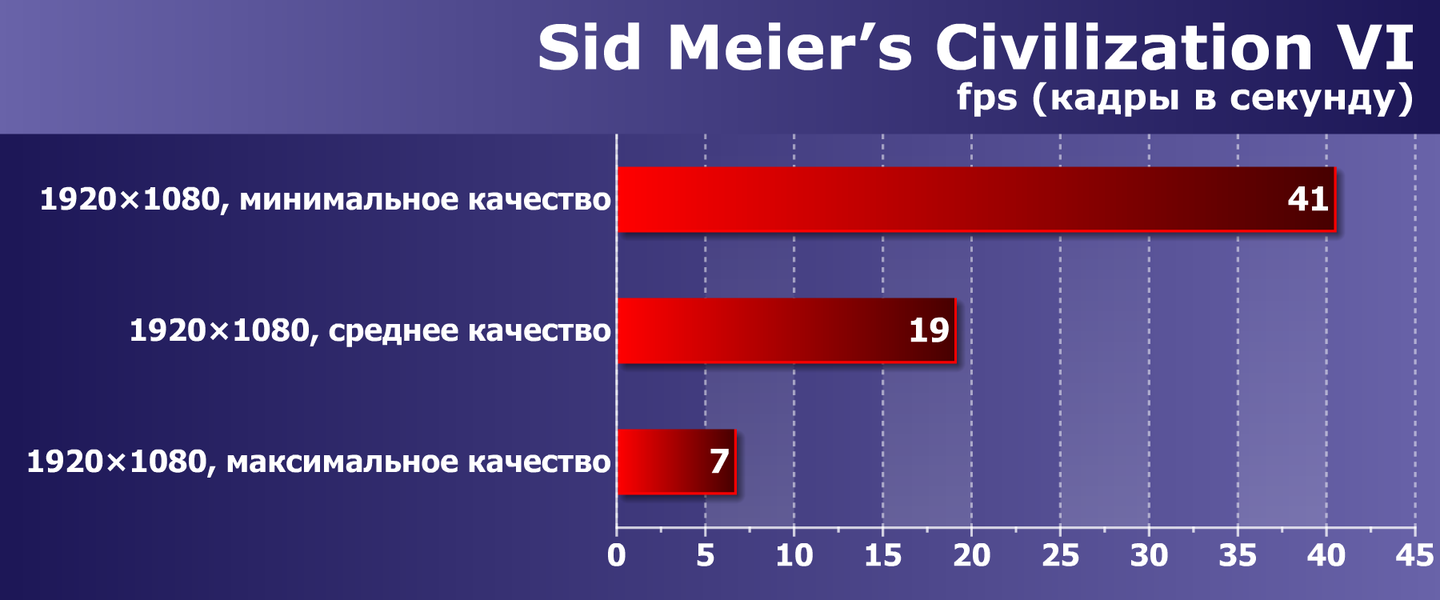 Пошаговая стратегия Sid Meier’s Civilization VI (мы тестировали ее с расширением Gathering Storm) отлично выглядит в Full HD даже на минимальных настройках графики, но поскольку динамика здесь не важна, можно смело увеличивать качество графики как минимум до среднего и включать полноэкранное сглаживание, чтобы мелкие детали выглядели еще лучше. Даже при 20 fps никакого подтормаживания не ощущается, анимация плавная, камера переключается на новый ракурс оперативно.
