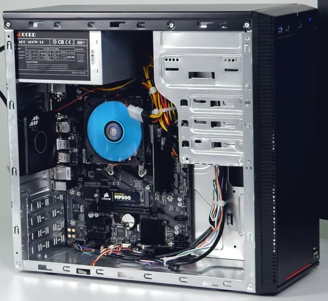 iRU предлагает несколько модификаций компьютера Home 225, у которых могут различаться объем оперативной памяти, SSD или HDD, а также предустановленная операционная система. Есть и несколько вариантов с иным процессором AMD и установленной дискретной видеокартой Nvidia начального уровня, но абсолютное большинство моделей использует именно процессор AMD Ryzen 5 2400G и его интегрированную графику. В зависимости от модификации Home 225 может быть собран в разных корпусах, в нашем случае использовался простенький довольно компактный microATX-корпус. Даже у такого небольшого компьютера внутри очень просторно, потому что в нем не установлены ни видеокарта, ни винчестер, ни оптический привод. По сути, кроме материнской платы с небольшим кулером на процессоре и одного вентилятора сзади (80 мм) здесь есть только провода — и, конечно, блок питания, в данном случае это бюджетная модель Accord ACC-400W-12 на 400 Вт (252 Вт по линии 12 В). При желании в корпус можно установить одно устройство формата 5,25″ с внешним доступом, три устройства формата 3,5″ (два с внешним доступом и одно без) и одно устройство формата 2,5″. Также можно установить на переднюю стенку большой вентилятор (до 140 мм), который, правда, не будет напрямую обдувать накопители, и смонтировать один вентилятор (80 мм) на съемной левой боковой стенке. Размеры корпуса (Ш×Г×В): 16,5×38×35,5 см.