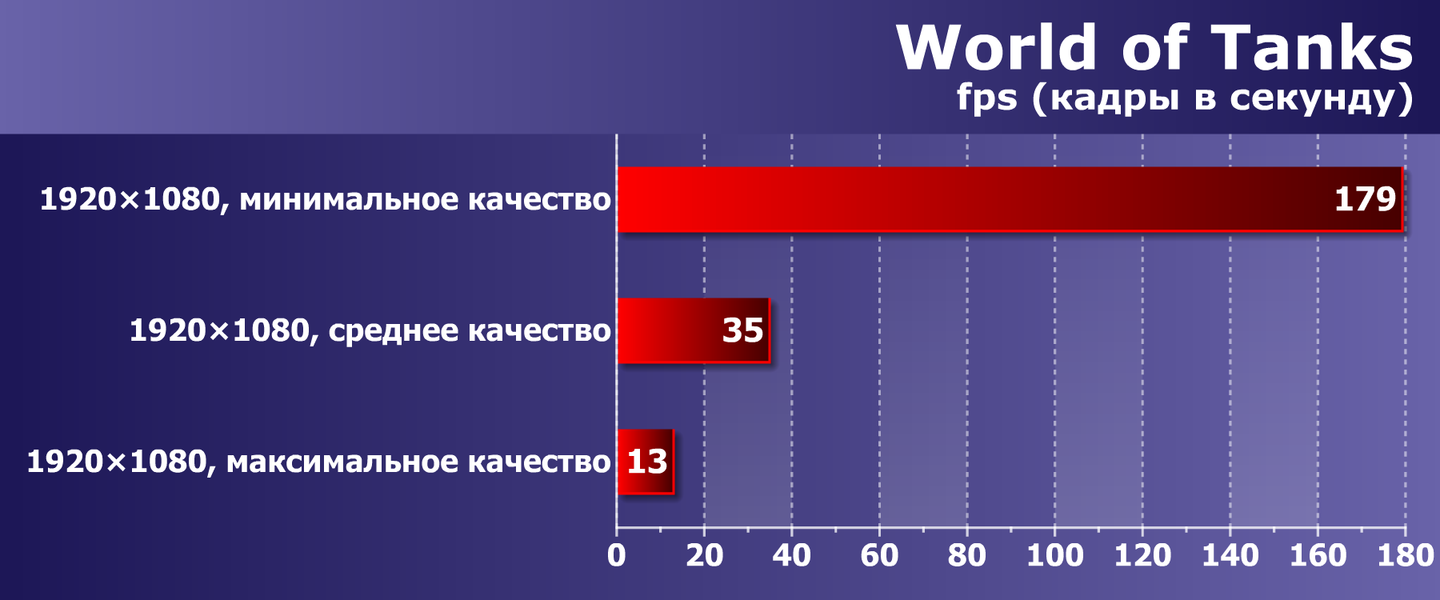 В аркадном танковом симуляторе World of Tanks система обеспечивает около 180 fps в не очень интересном минимальном качестве, но компьютер «тянет» и среднее качество, уже позволяющее насладиться графикой обновленного движка Core. Однако 35 fps все-таки может быть маловато для динамичных танковых сражений, тогда придется понизить разрешение, чтобы не отказываться от красот.