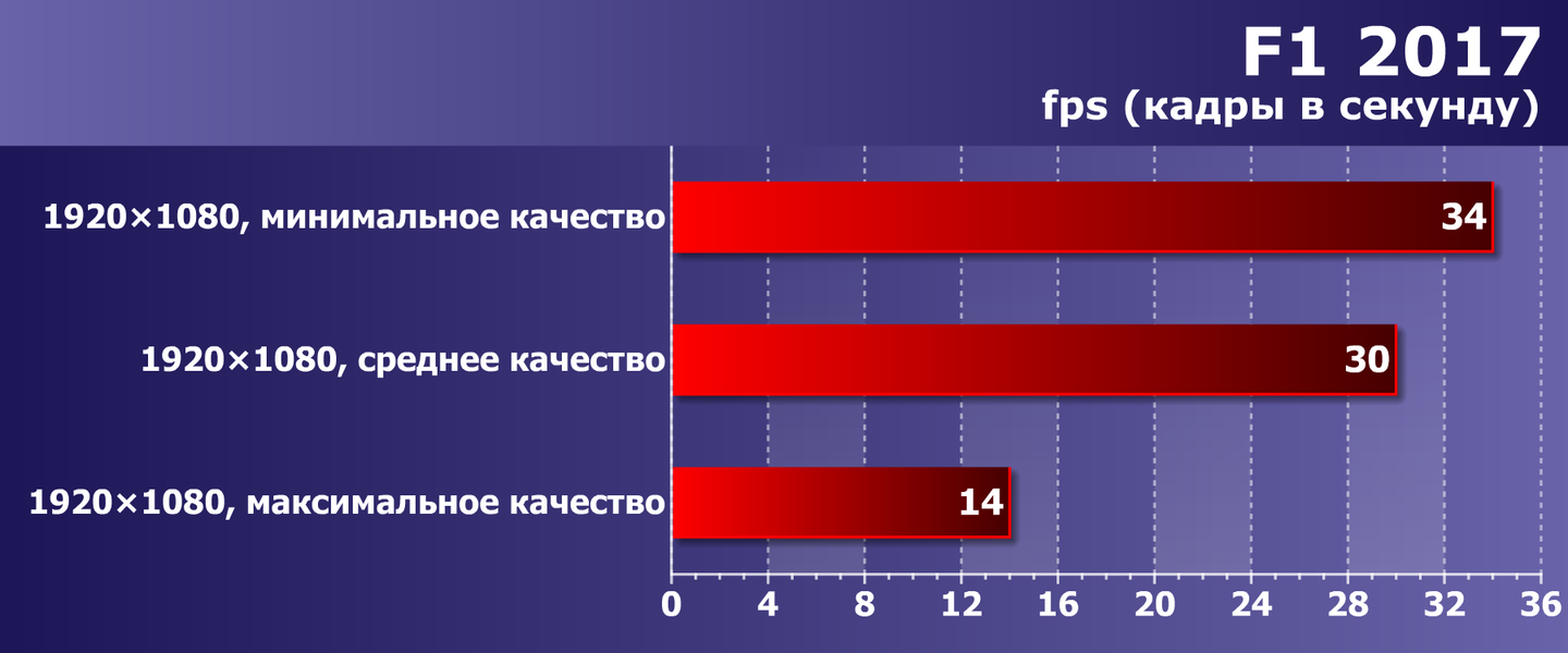 Гоночный симулятор F1 2017 уже со средних настроек качества обеспечивает приемлемый уровень скорости, здесь игрок должен сам решать, достаточно ли ему 34 fps для динамичной гонки или лучше снизить разрешение.