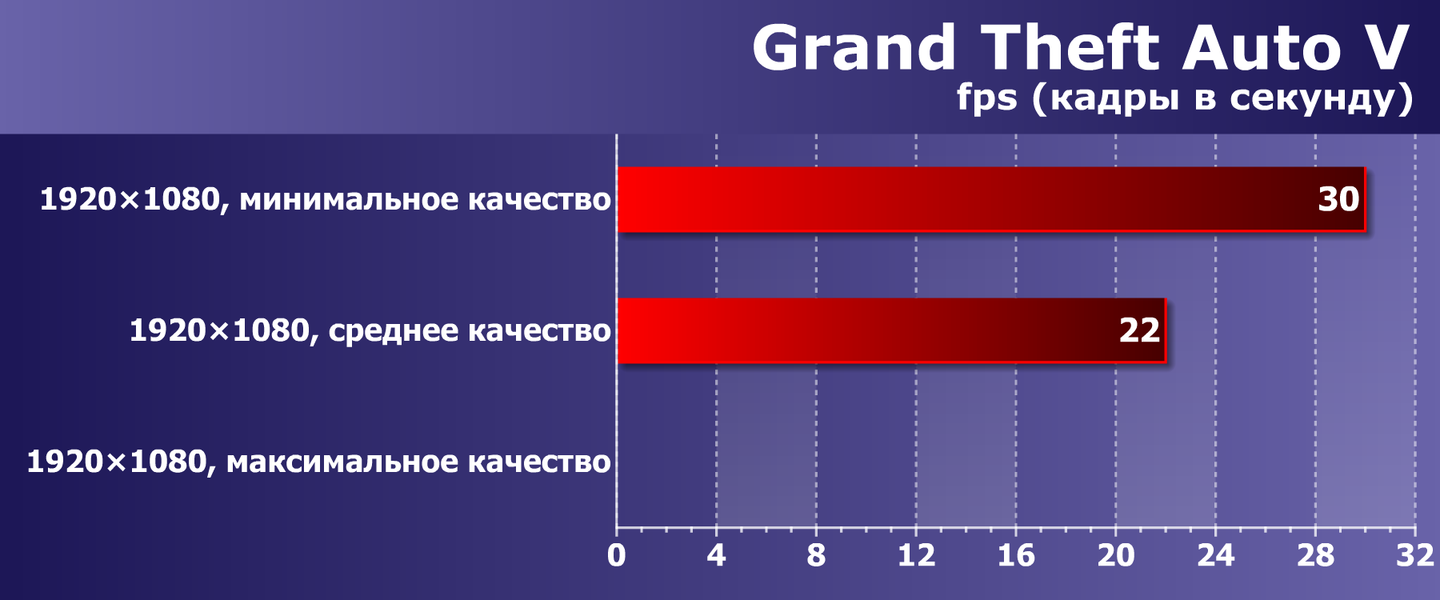 В приключенческой игре Grand Theft Auto V система обеспечивает вполне комфортные 30 fps при минимальном качестве графики, этого, в принципе, достаточно.