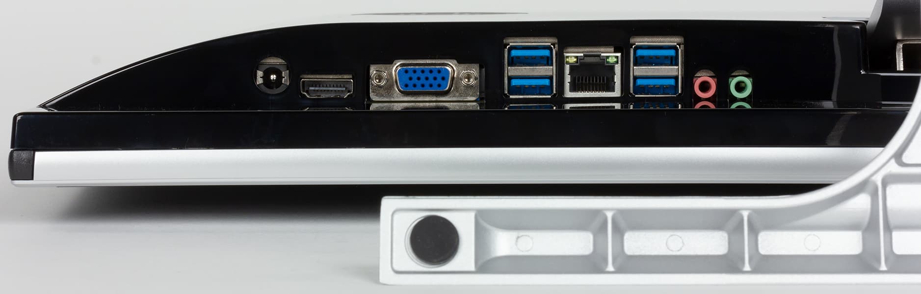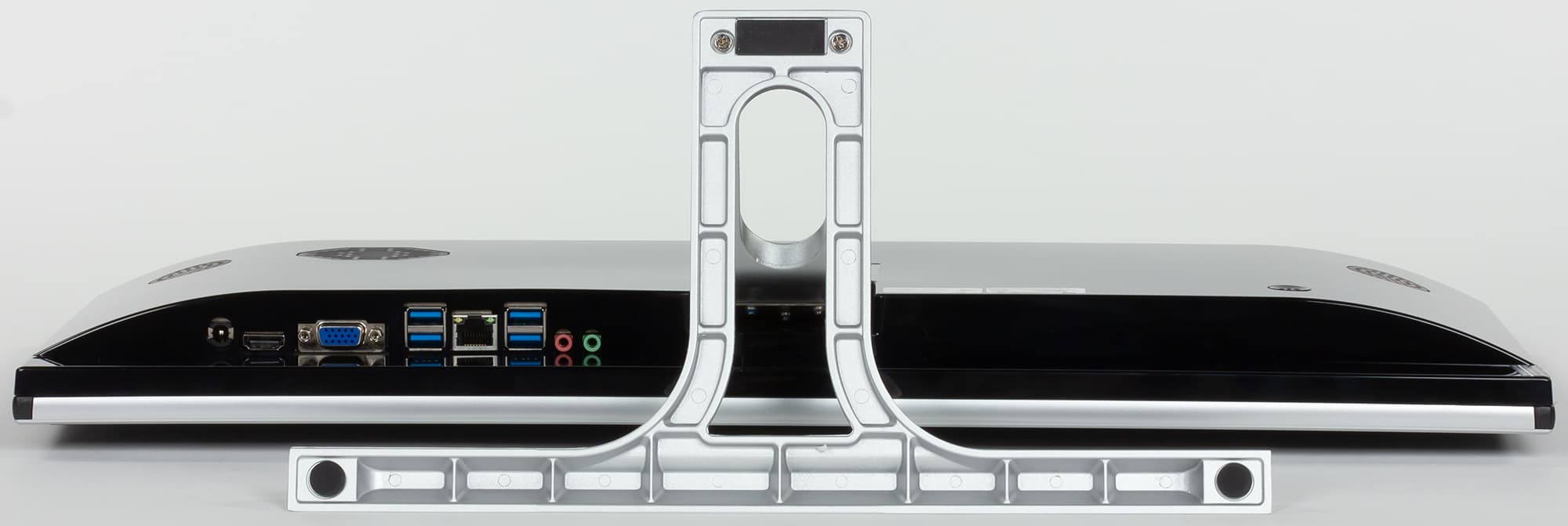 Что же касается количества и расположения имеющихся в наличии интерфейсных портов, то оно вызывает вопросы. Особенно второе — в данном случае все доступное расположено на нижней грани «монитора». По сути это означает то, что быстрого доступа к портам не будет — воткнуть вслепую какую-нибудь флэшку даже при наличии сноровки не так-то просто. Кроме того, моноблок снабжен всего четырьмя USB-портами, а встроенные динамики, мощностью 3 Вт каждый, дополнены лишь парой аудиоразъемов — выходом на наушники и входом микрофона (причем, как и все остальные, они тоже расположены снизу). С другой стороны, при использовании устройства по целевому назначению (заложенному прямо в название) все это не мешает. В офисе к нему, скорее всего, будут подключены только проводная сеть, мышь и клавиатура. Возможно, аудиогарнитура — и все. Причем один раз и навсегда :) Флэшки из обихода начали потихоньку исчезать, разнообразные периферийные устройства в больших количествах нужны, скорее, домашнему, а не офисному пользователю. Однако размести компания еще пару USB-портов на левой (например) грани устройства — хуже в этом случае не стало бы точно никому, а лучше — могло бы.