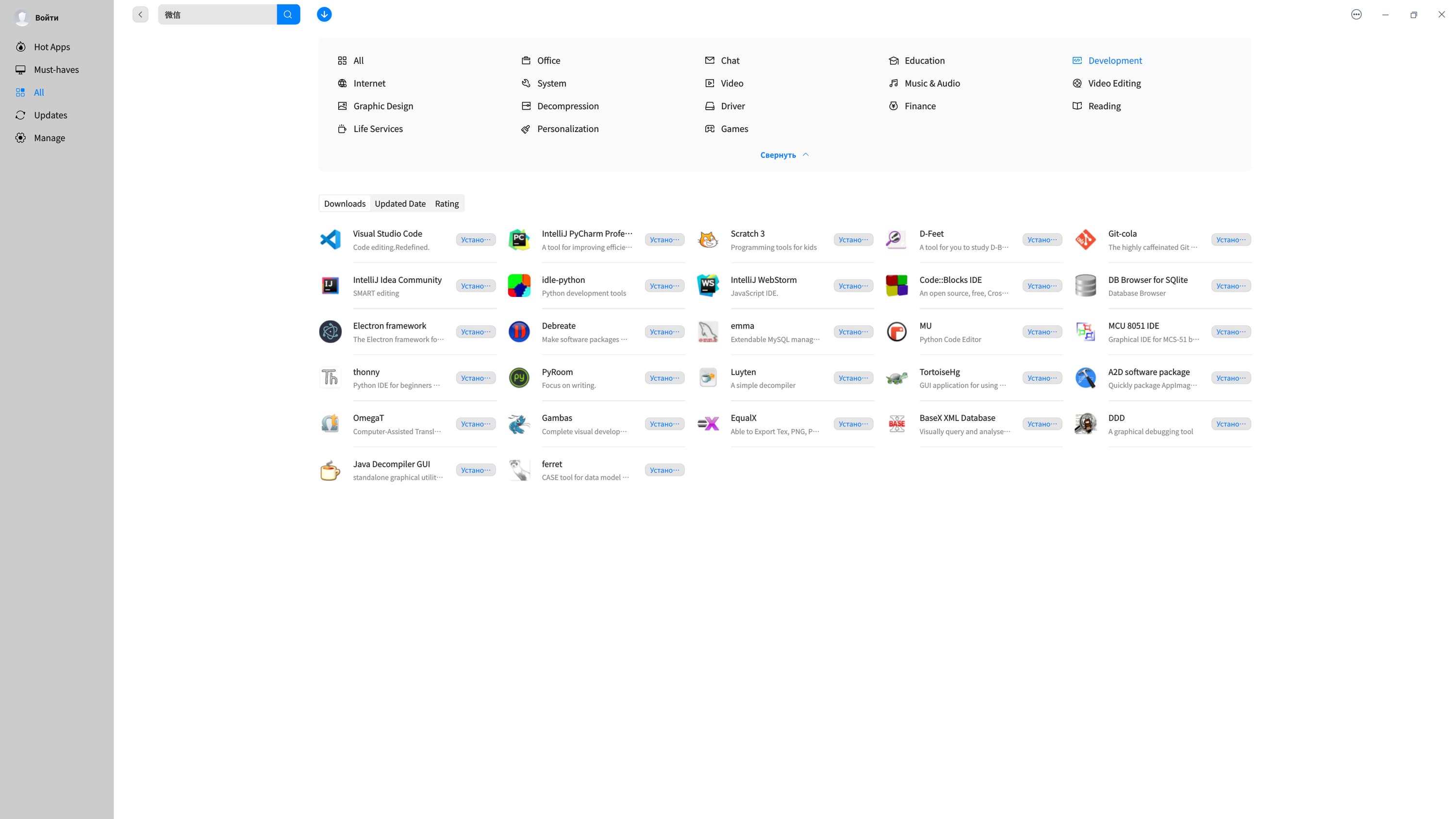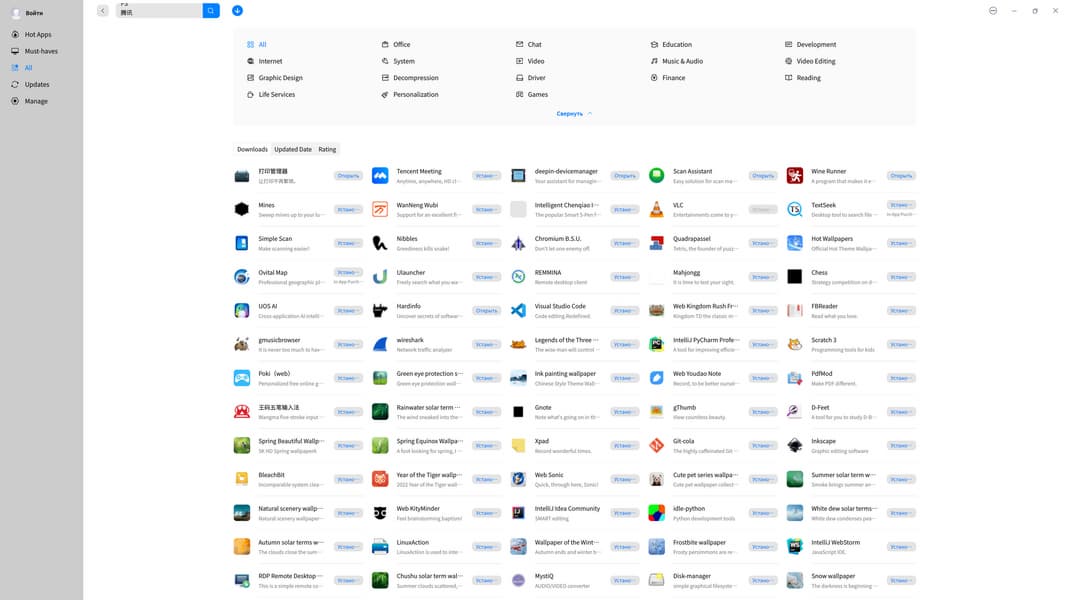 Как мы уже упоминали, в составе операционной системы UOS есть собственный магазин приложений — в современных ОС без этого никуда, пользователю нужна удобная среда для поиска и установки ПО. Магазин этот достаточно продвинутый и обширный, предлагает много возможностей, и его единственный недостаток для пользователей не из Китая — отсутствие перевода большой части надписей с китайского языка на любой другой. Но догадаться или перевести текст переводчиком при помощи камеры мобильного телефона обычно вполне получается.