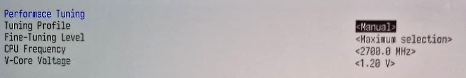 В подразделе настройки производительности (в его английском названии есть опечатка) есть возможность выбора профиля разгона, изменения количества шагов тактовой частоты, выбора самой частоты CPU, а также регулировка напряжения процессора. В принципе, всё необходимое для разгона CPU вроде бы имеется, но мы бы хотели видеть еще и возможность выбора частоты и настройку таймингов памяти.