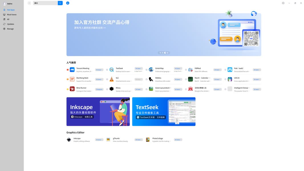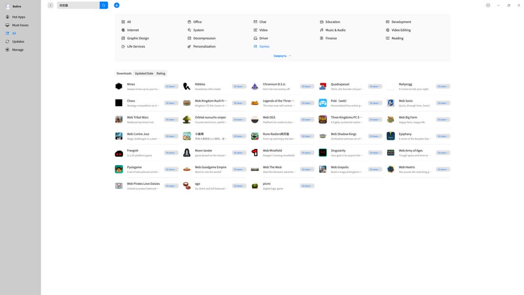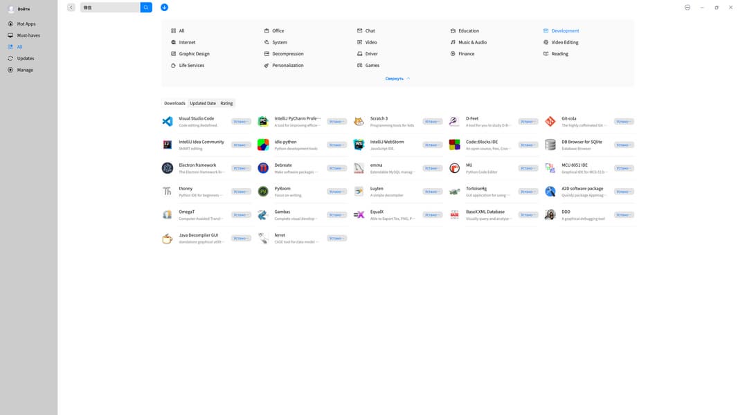 Есть разделы по категориям ПО, по рейтингу и т. п., поддерживается автоматическое обновление, есть отзывы пользователей — всё как полагается современному магазину приложений. Однако количество представленных программ невелико — несравнимо с возможностями выбора в более популярных системах. К примеру, в магазине нет (по крайней мере, не было на момент подготовки материала) даже полноценного офисного пакета. Ни в комплекте ОС, ни в магазине его не найти, хотя при помощи поиска мы обнаружили на китайском сайте пакет WPS Office в родной для LoongArch64 версии.