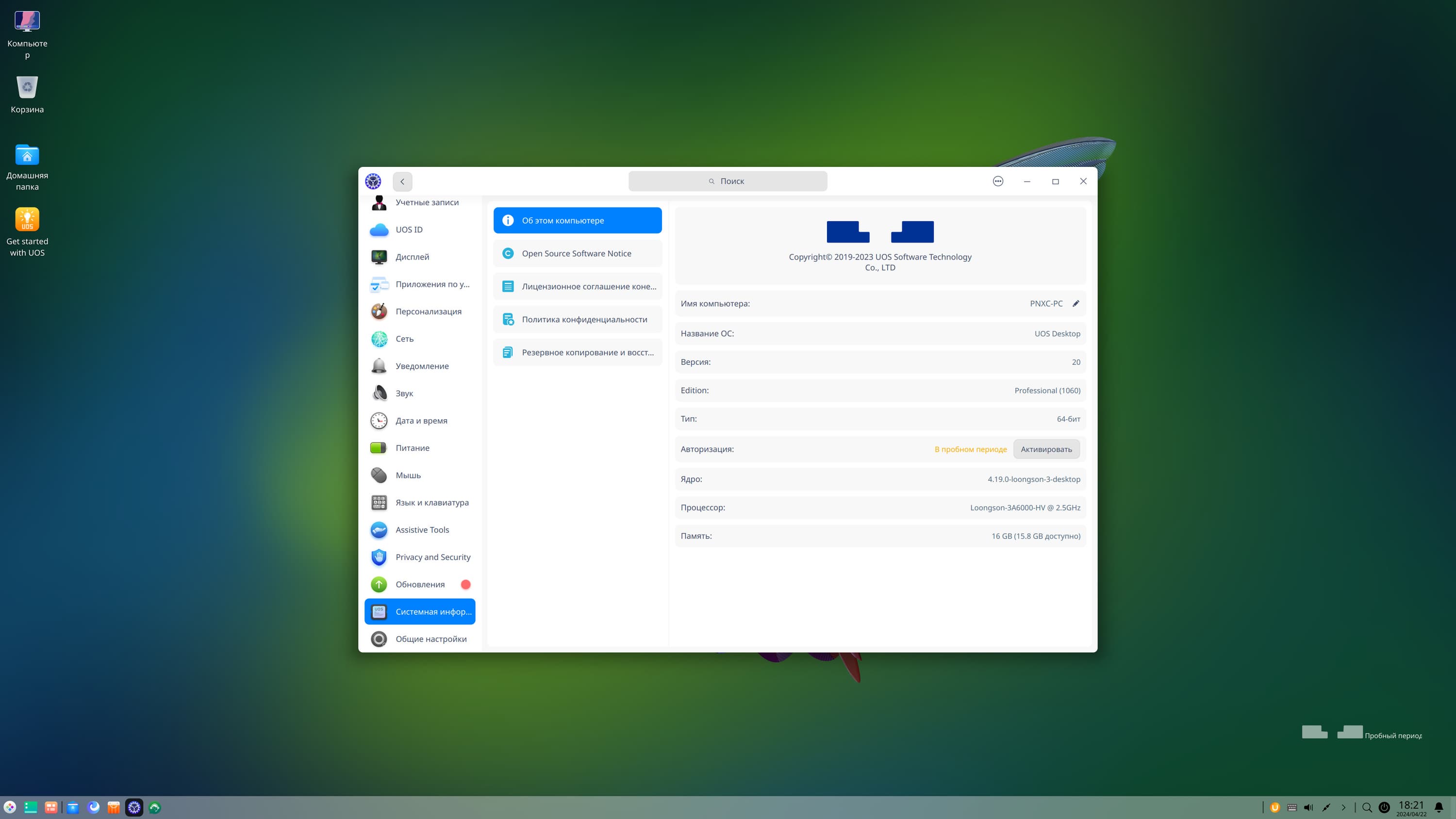 Попавшая к нам готовая система PNXC имеет предустановленную операционную систему UOS на базе Linux, а на плате Asus мы использовали в тестах Loongnix, также имеющую в основе Linux, так что сейчас вкратце расскажем о своих впечатлениях от обеих систем, которые отличаются по большей степени внешним видом. Впрочем, применяемые в них оболочки визуально не так уж сильно отличаются от других современных операционных систем.