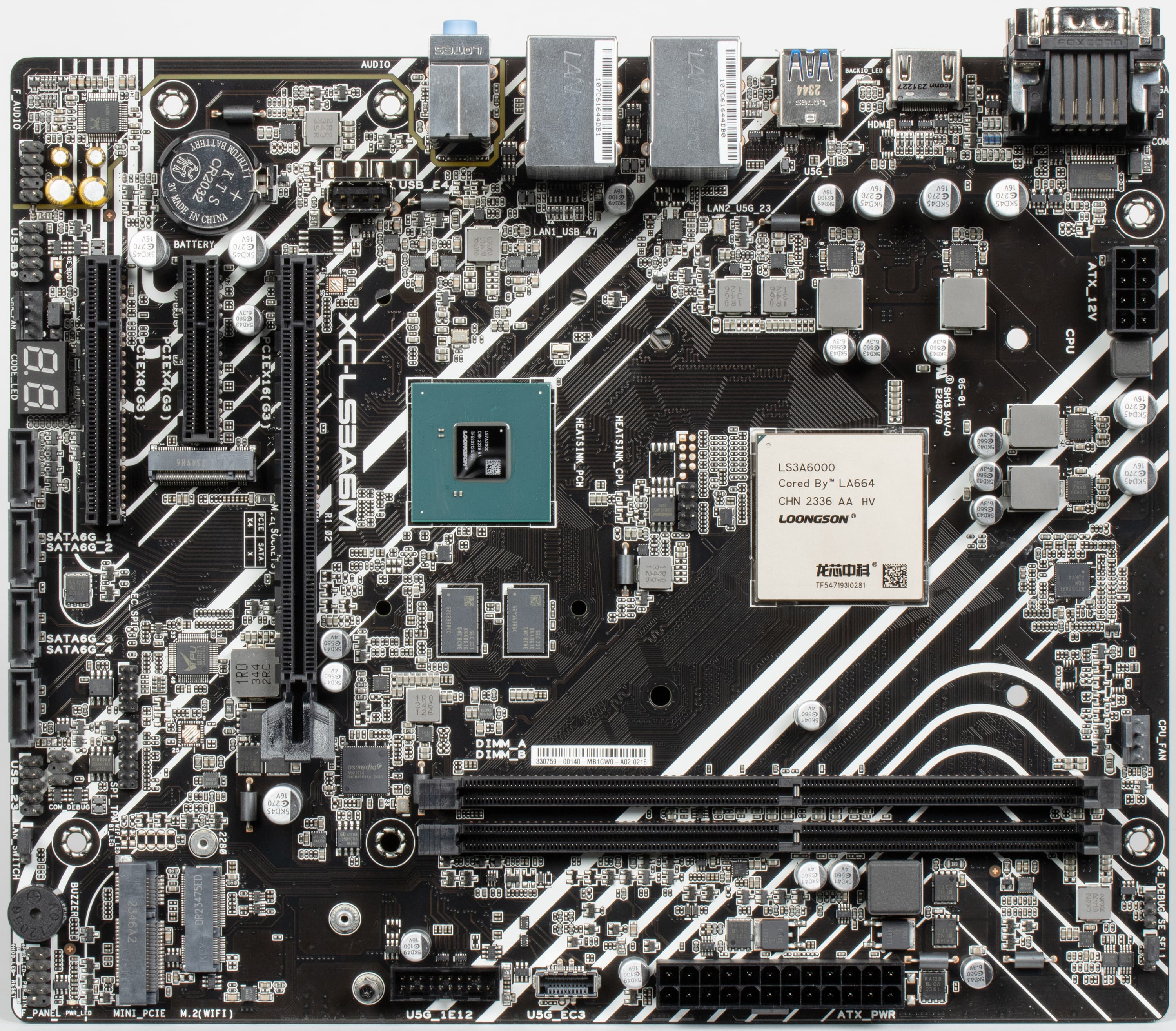 Как мы уже писали, в нашем распоряжении было две разные системы на основе Loongson 3A6000: предварительно собранный китайский ПК, содержащий полный набор аппаратного обеспечения, и отдельная системная плата XC-LS3A6M с напаянным на нее процессором и комплектным воздушным кулером, слегка отличающаяся по возможностям. Процессоры в этих системах — одинаковой модификации, они отличаются только датой изготовления и напаяны прямо на соответствующие системные платы.