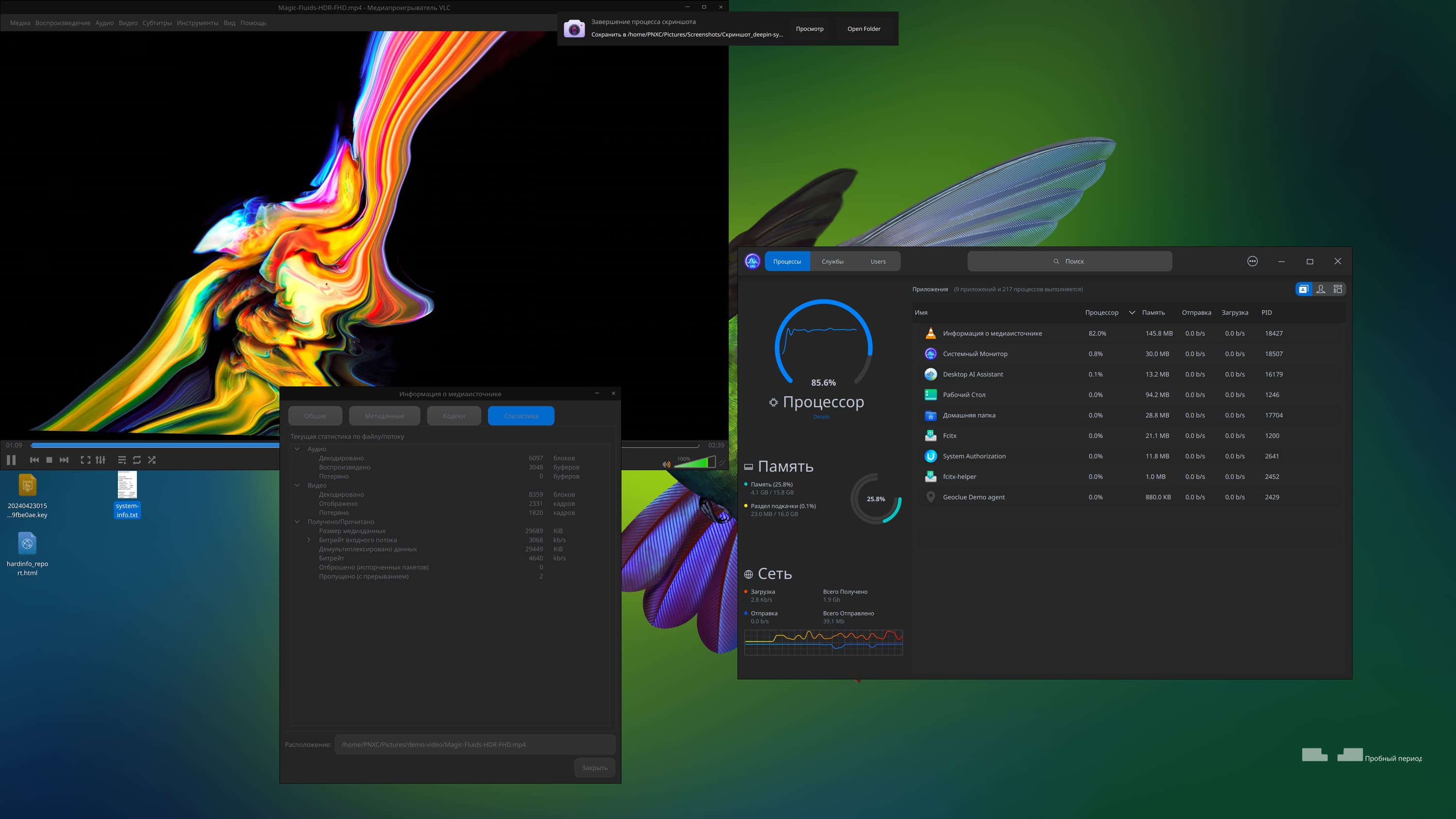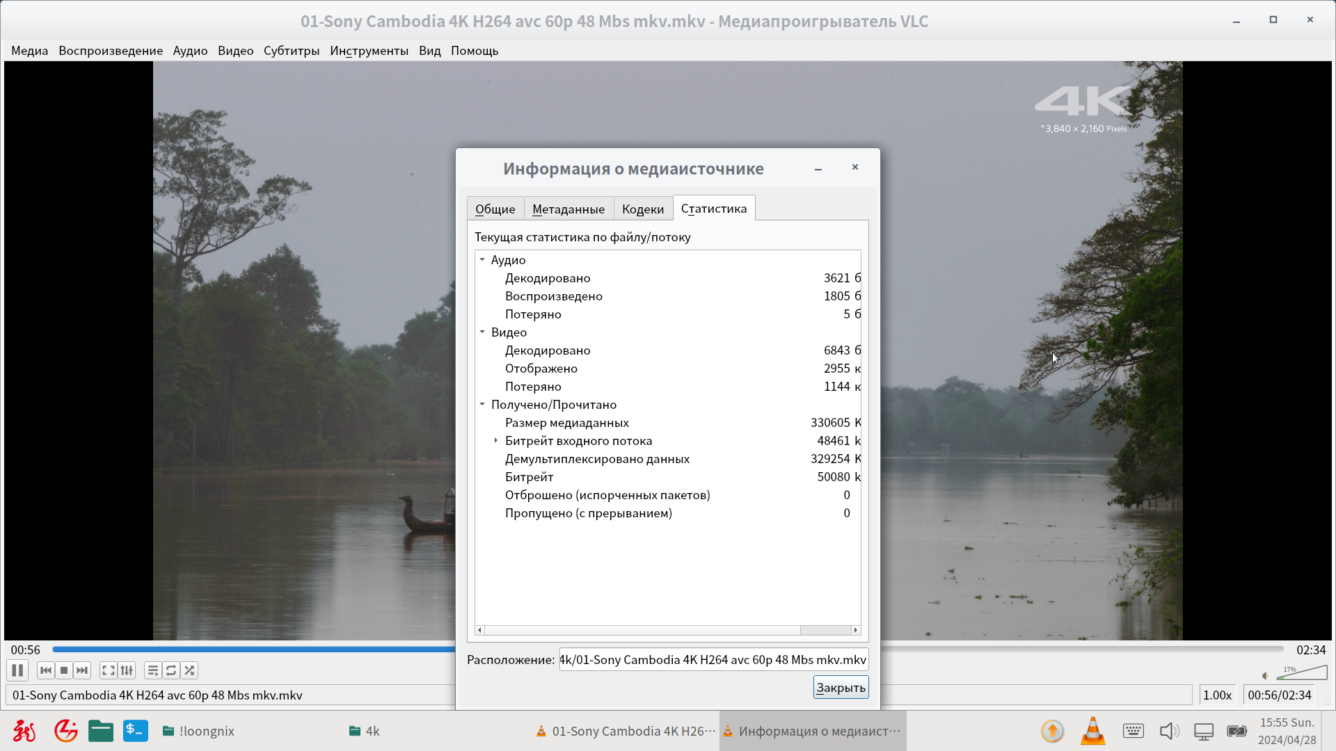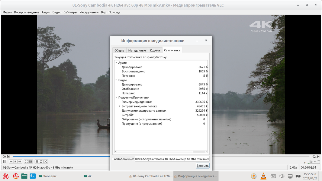Понятно, что можно попробовать перебирать ПО и кодеки, но такой глубокой цели в этот раз у нас не было. Интересно, что в операционной системе Loongnix получилось почти с точностью до наоборот: встроенный в систему плеер довольно медленный и пропускает кадры даже в разрешении Full HD, а вот VLC работает довольно хорошо, хотя и не сильно лучше встроенного плеера в UOS. Потерь кадров всё равно довольно много — см. статистику проигрывания на иллюстрации. И не хватает именно возможностей GPU по декодированию, потому что в системе с установленной дискретной видеокартой Radeon RX 480 всё было намного лучше: практически все видеоролики «летают», кроме разве что 4K HDR HEVC и 8K.