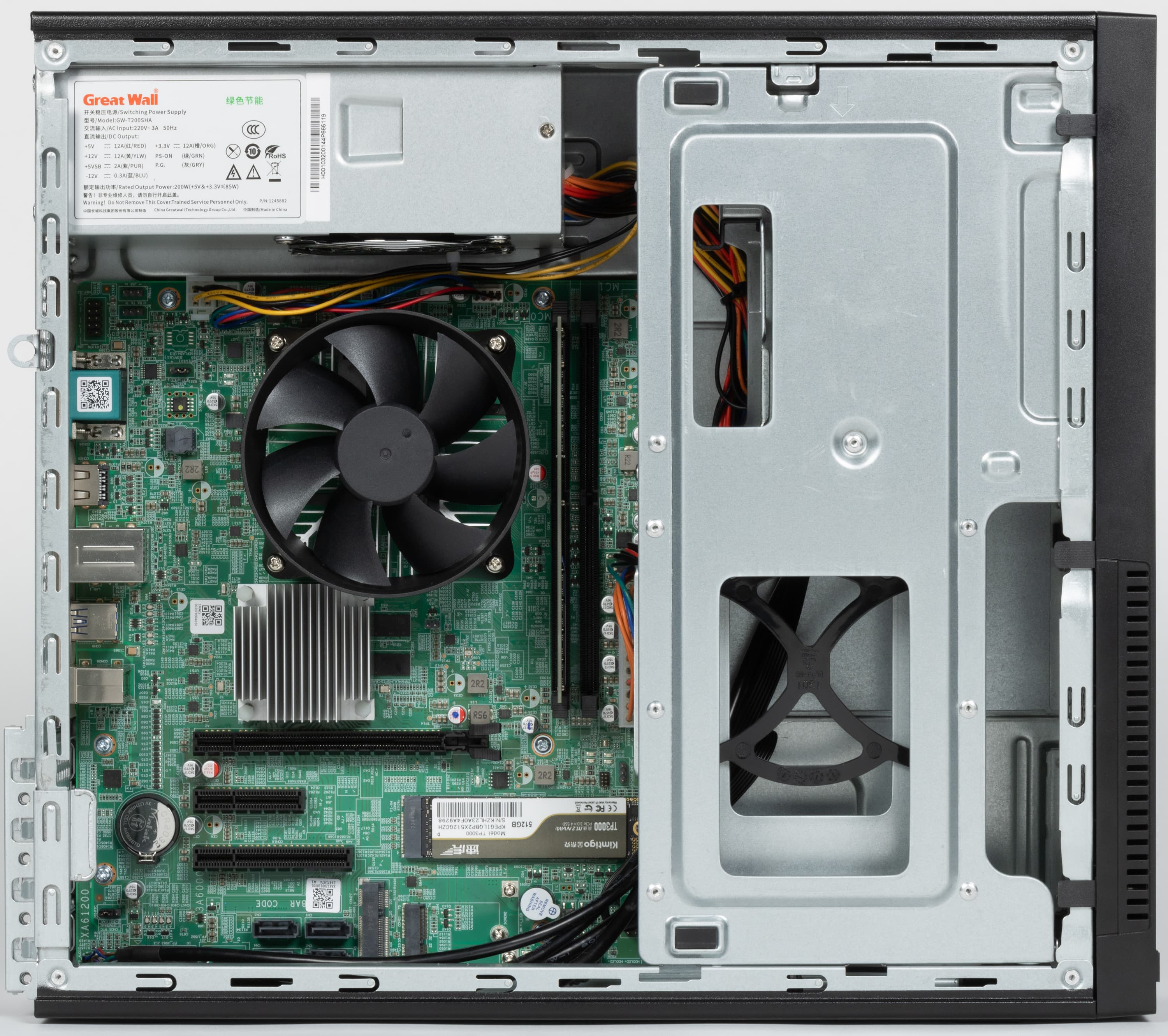 Сначала рассмотрим готовую систему компании PNXC, которая изображена на фото в начале статьи. Она основана на системной плате PN-L530A, использующей чипсет 7A2000 и припаянный процессор Loongson 3A6000 модификации HV с комплектным воздушным кулером, а также дополнительными комплектующими, требующимися для работы: накопителем для данных и модулем оперативной памяти. Дополняет этот ПК сравнительно маломощный, но вполне достаточный блок питания и компактный корпус — удобный и просторный, скорее даже излишне большой для столь простой системы.
