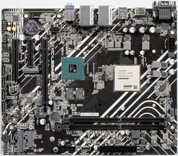 Системная плата XC-LS3A6M имеет черный текстолит, она стоит несколько дороже условно безымянной зеленой, и предлагает чуть больше возможностей для расширения: количество слотов памяти, PCIe и M.2 у обеих плат одинаковое, но на XC-LS3A6M есть второй сетевой адаптер и разъем для подключения внешнего порта USB 3.2 формата Type C. Без документации непонятны некоторые тонкости работы применяемых контроллеров и разделение линий PCIe, а толковых документов у производителя просто нет.