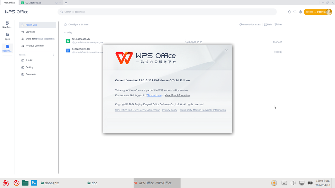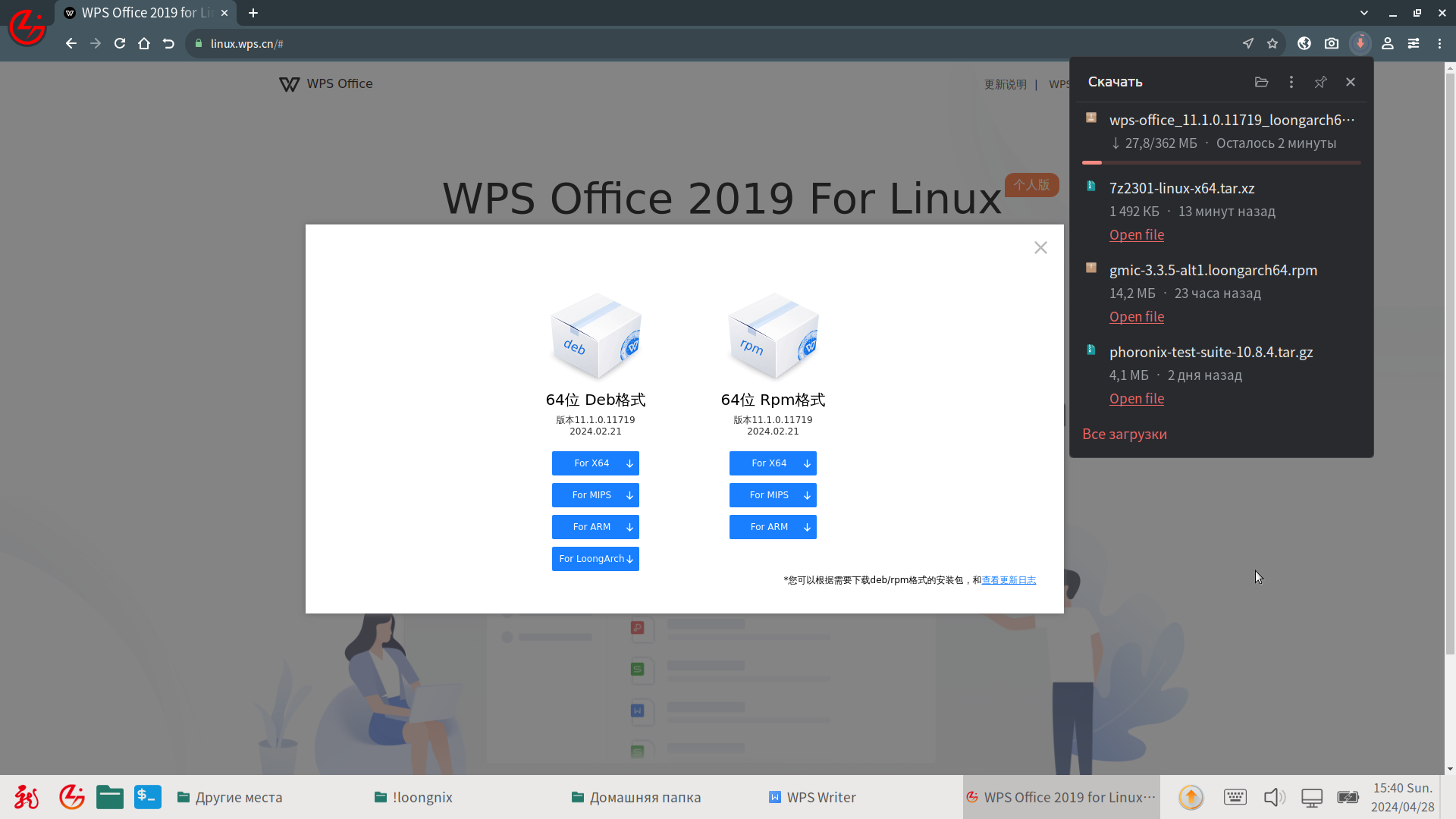 Есть у WPS свои плюсы и минусы, на которых мы не будем останавливаться, это точно не лучший офисный пакет, но для столь редких систем главное, что он вообще есть и его достаточно легко скачать и установить. Единственное, что слегка напрягло — довольно устаревшая версия 11.1 (см. скриншот), доступная в варианте для LoongArch64, хотя уже существует 12.2 для Windows, поэтому некоторых современных возможностей в ней может не быть, хотя работать вполне можно.