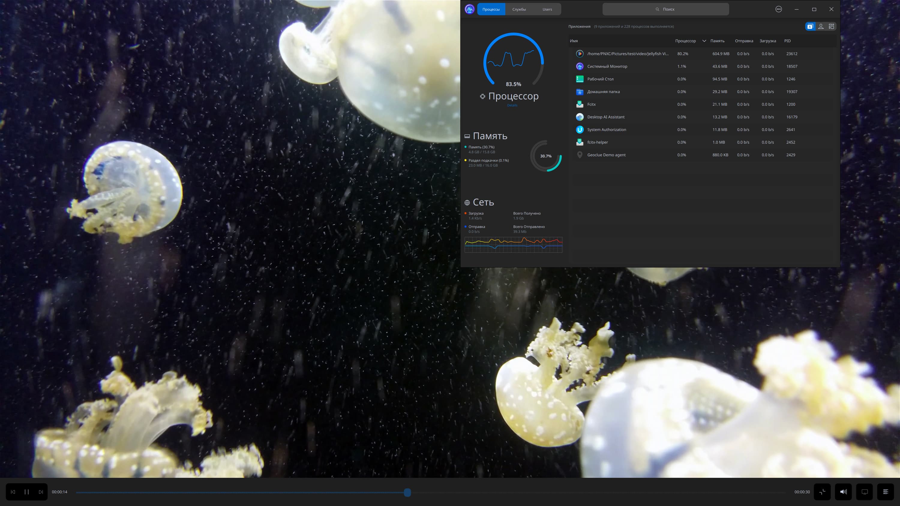На практике мы отметили некоторую разницу между операционными системами и медиаплеерами, которая может быть обусловлена, к примеру, разницей в степени постобработки видеоданных. Если брать систему UOS и популярный медиаплеер VLC, то эта связка неплохо справилась лишь со старыми видеоформатами вроде MPEG2 и MPEG4, и только в разрешении Full HD, уже при просмотре H.264 загружает работой центральный процессор на 50%-80%, декодирование в формате H.265 не тянет вовсе, теряя кадры, а почти любой формат в 4K-разрешении даже не пытается выводиться на экран. Потерь кадров при высокой загрузке процессора получается довольно много, и смотреть ролики некомфортно.