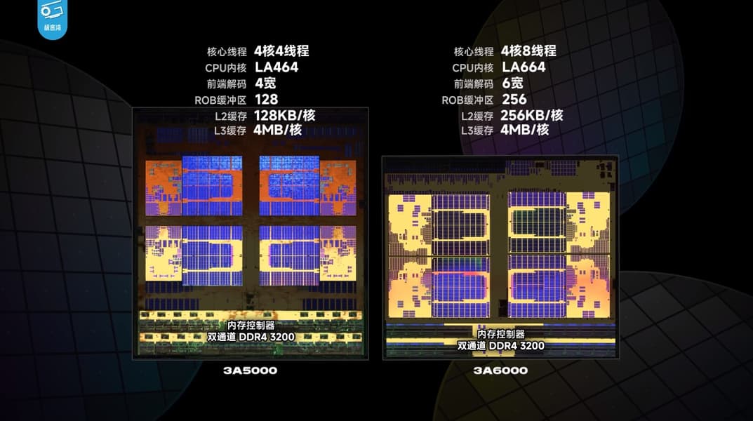 Loongson 3A6000 использует более новые ядра LA664 по сравнению с LA464 в 3A5000. Новые вычислительные ядра были серьезно переделаны, хотя архитектура осталась прежней. LA664 отличается более глубоким конвейером с бо́льшим количеством исполнительных блоков и поддержкой многопоточного исполнения (SMT), что дополнительно повышает производительность в современных многопоточных задачах при довольно небольших затратах на проектирование. В итоге рассматриваемый четырехъядерный процессор основан на четырех вычислительных ядрах LA664 с поддержкой технологии многопоточности — как и современные модели AMD и Intel, он поддерживает вдвое больше вычислительных потоков (логических ядер): восемь штук на процессор. Добиться правильной работы SMT не так уж просто, те же AMD и Intel не сразу пришли к достаточно эффективным технологиям, а работу китайской компании можно оценить по тому, что по сравнению с предшественником 3A5000 однопоточная производительность модели 3A6000 увеличилась на 32%, а многопоточная — на 84%.