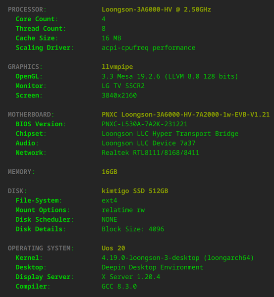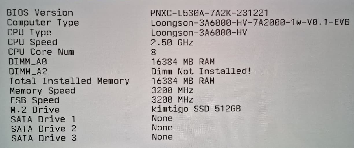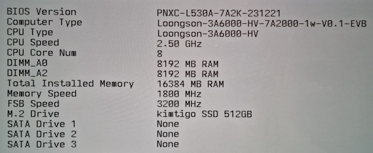 - Процессор: Loongson 3A6000 (4 ядра/8 потоков, 2,5 ГГц)