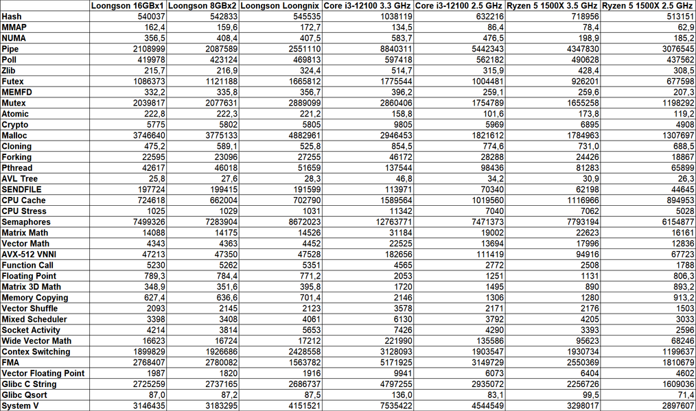 Это также было очень непросто, потому что какие-то тестовые пакеты вообще не предназначены для этой архитектуры и попросту не работоспособны на ней, другие используют библиотеки и другие оптимизации исключительно архитектуры x86-64, и не собираются на других CPU. И даже если в коде нет жесткой привязки к архитектуре, то могут возникнуть проблемы со сборкой, и даже если их решить, то выбранное ПО может не работать корректно, не выдавая результатов вовсе или завершая работу теста с ошибкой. Так что имеем то, что имеем — лишь те тесты из пакета, которые запустились на системе с Loongson в принципе. К слову, часть из них может использовать двоичную трансляцию x86-кода, а не родной код, но определить это сходу не так уж просто.