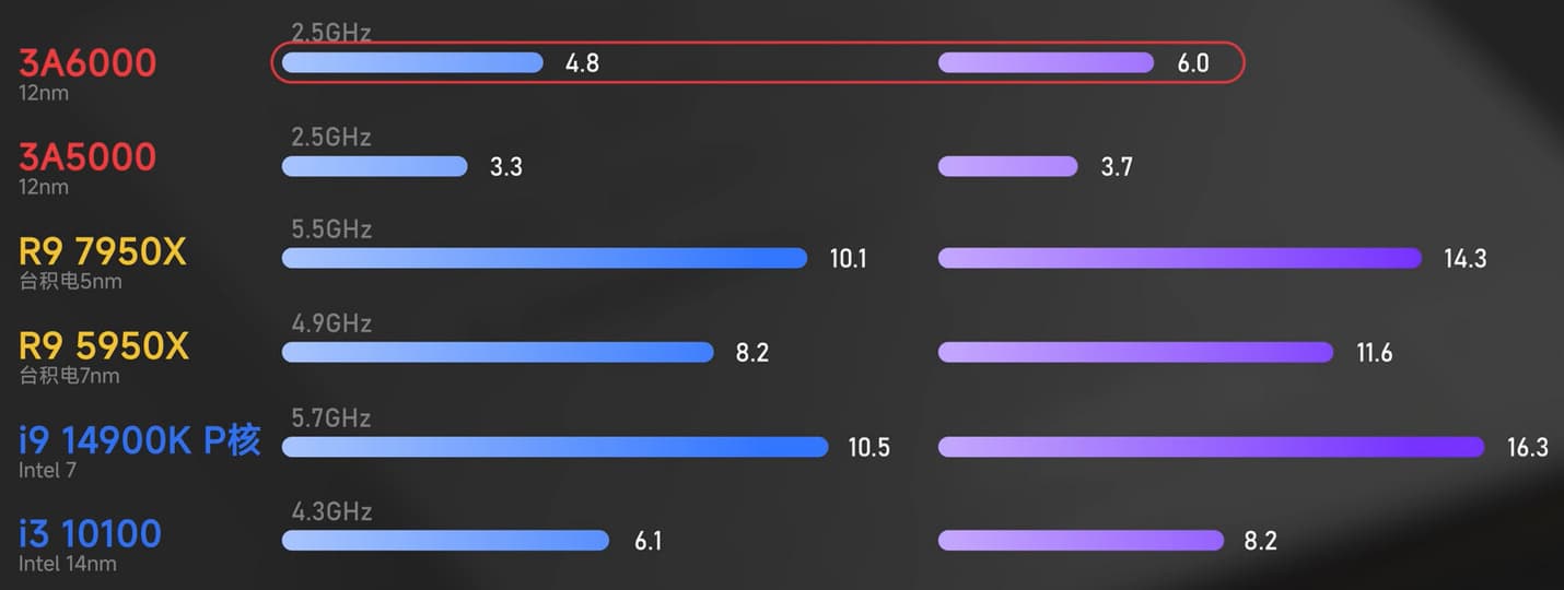 Компания Loongson Science and Technology, поддерживаемая Китайской академией наук, была создана более десяти лет назад и выпустила уже несколько серий процессоров, в том числе Loongson нескольких поколений. Она была известна и ранее, предыдущие процессоры получили определенное распространение, но не такое широкое, поскольку влияние санкций еще не было существенным. В 2022 году у них появились серверные модели Godson 3C5000 и 3C6000 с 16 ядрами, а позже вышел 32-ядерный 3D6000, включающий сразу два кристалла 3C6000 на одной подложке. Затем компания анонсировала более современный 3A6000, который отличается большим скачком в производительности на такт по сравнению с прямым предшественником 3A5000, уже обеспечивавшим весьма неплохую производительность на такт, но всё же недостаточно продвинутым и производительным для конкуренции с лучшими процессорами.