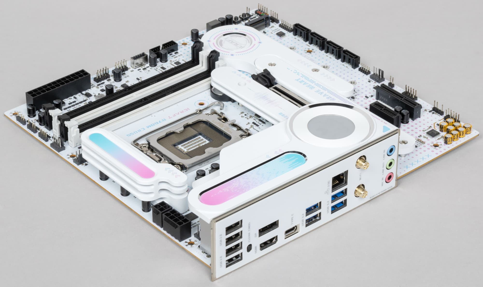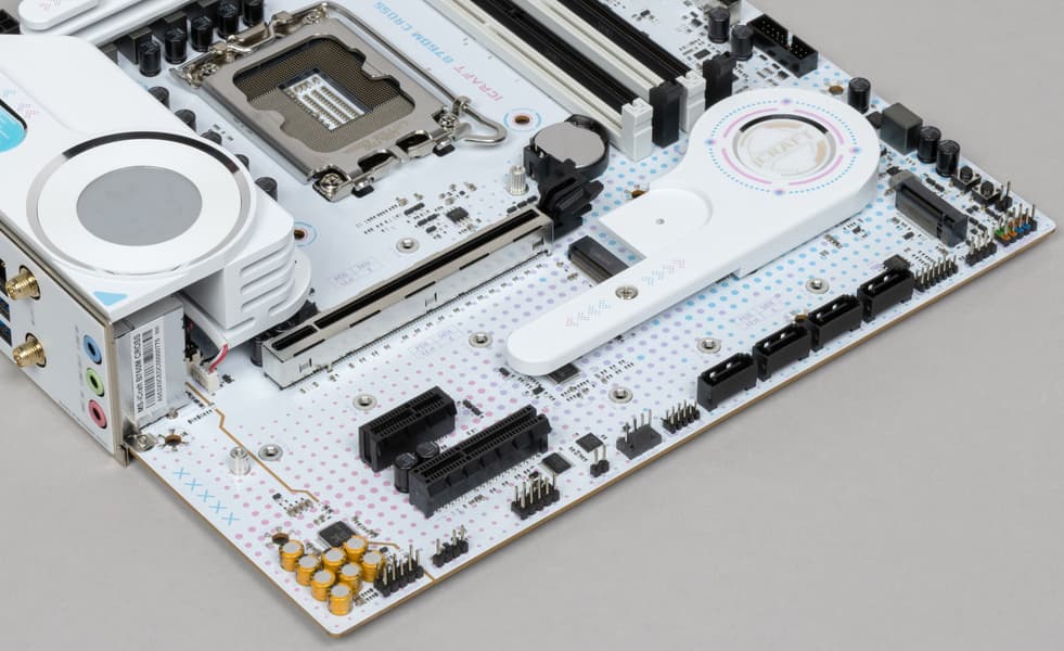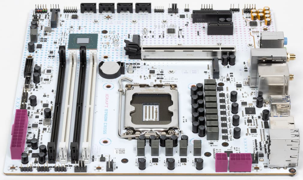 Напомним, что плата относится к топовой серии iCraft, система питания процессора у нее достаточно мощная, способная обеспечить работу любых совместимых процессоров с некоторым запасом на разгон, но позиционирование этой модели предполагает, скорее, работу с процессорами Intel Core i3 и Core i5. Также мы видим хорошую систему охлаждения каждого потенциально греющегося элемента, однако один из слотов M.2 не имеет штатного радиатора. Сетевые возможности включают проводной контроллер 2,5 Гбит/с и беспроводной Wi-Fi 6 + Bluetooth 5.2. В числе плюсов платы можно упомянуть широкие возможности для подключения дополнительных ARGB/RGB-устройств подсветки.