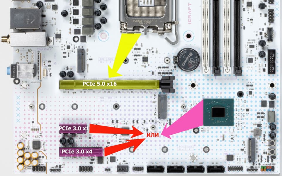 - Переключатель: или слот PCIe x1 или слот PCIe x4 (максимально 4 линии PCIe 3.0);