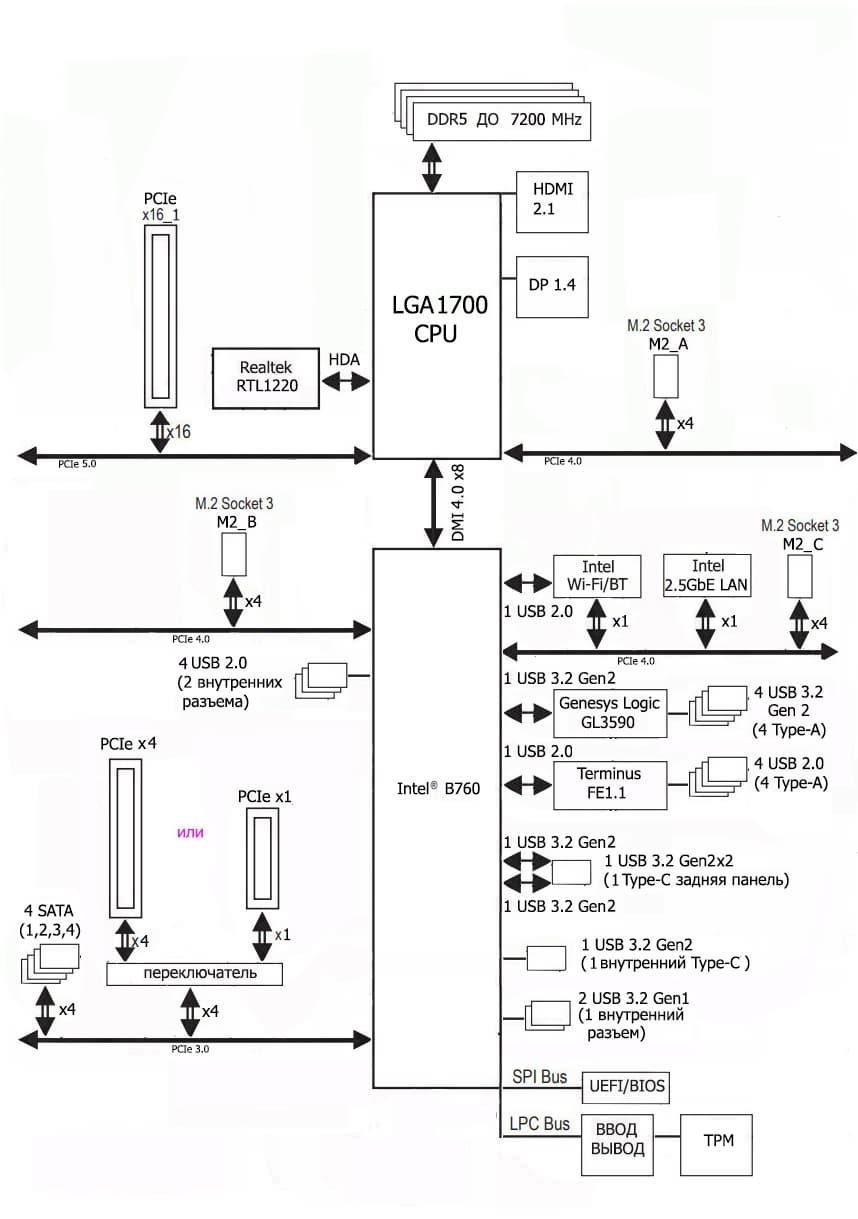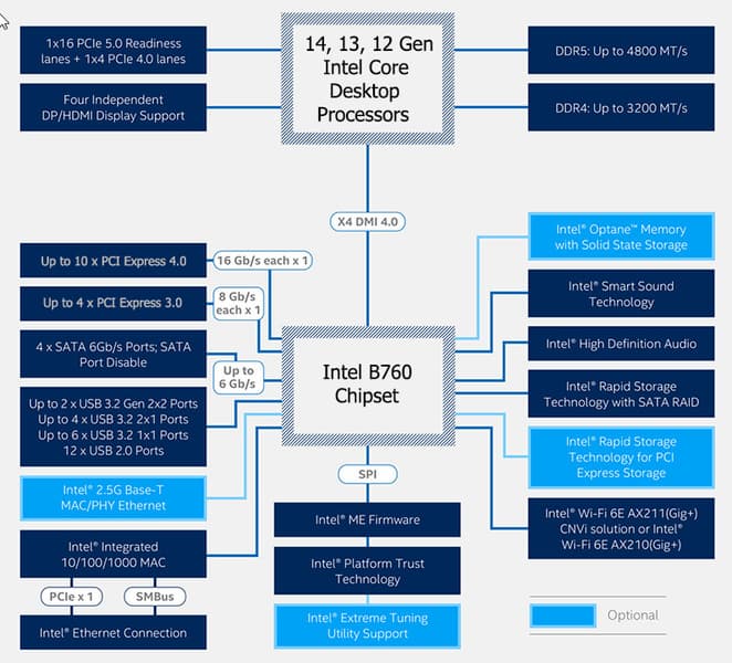 Процессоры Intel Core 12/13/14-го поколений (совместимые с сокетом LGA1700 и поддерживаемые B760) имеют 20 линий ввода-вывода (16 PCIe 5.0, 4 PCIe 4.0), не имеют USB и SATA портов. При этом взаимодействие с B760 идет по особому каналу Digital Media Interface 4.0 (DMI 4.0 x4 (именно х4!)). Все PCIe линии процессора идут на слоты расширения PCIe и порт М.2. Serial Peripheral Interface (SPI) используется для взаимодействия с системой UEFI/BIOS, а шина Low Pin Count (LPC) — для связи с устройствами ввода/вывода, не требующими высокой пропускной способности (контроллерами вентиляторов, TPM, старой периферии).