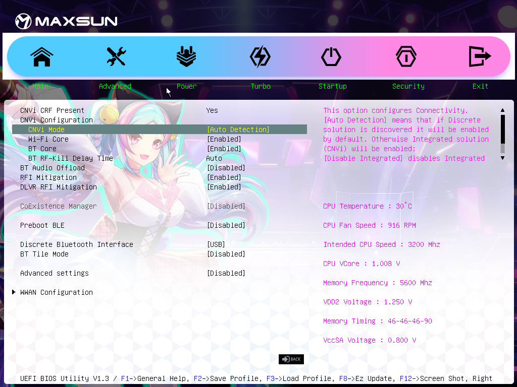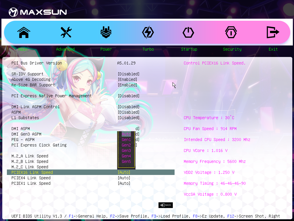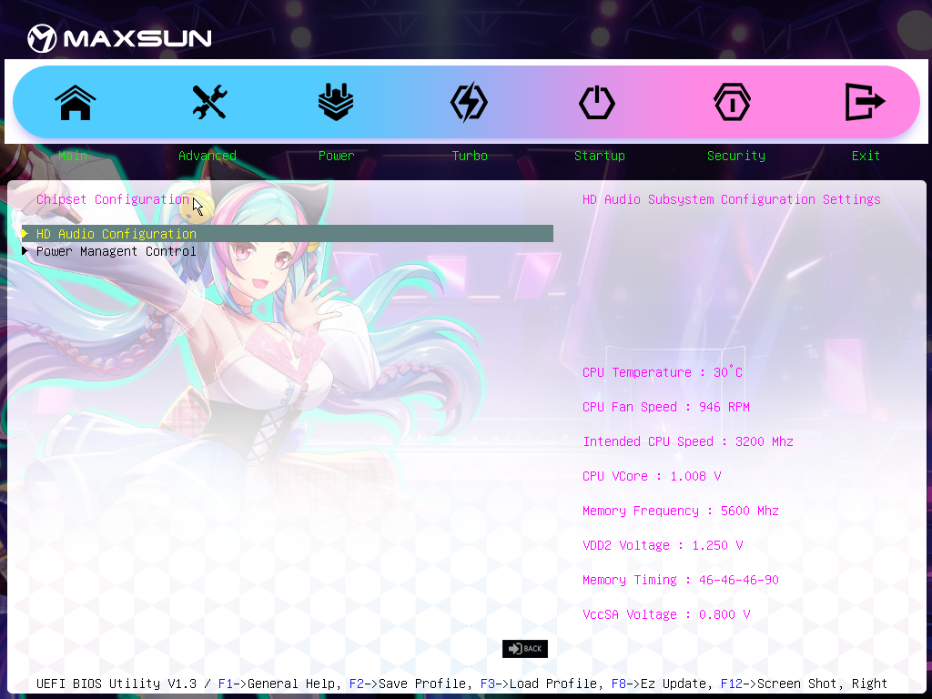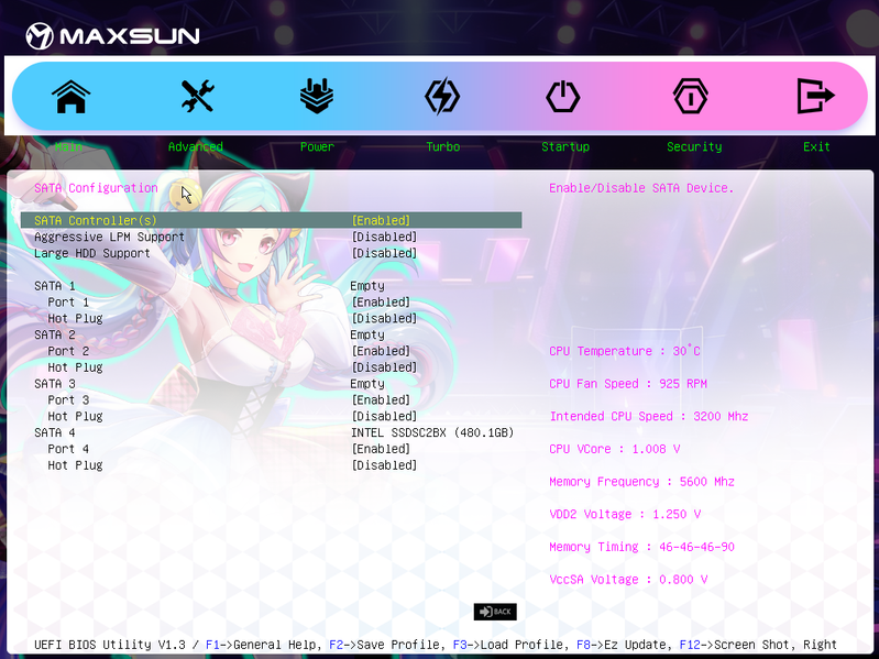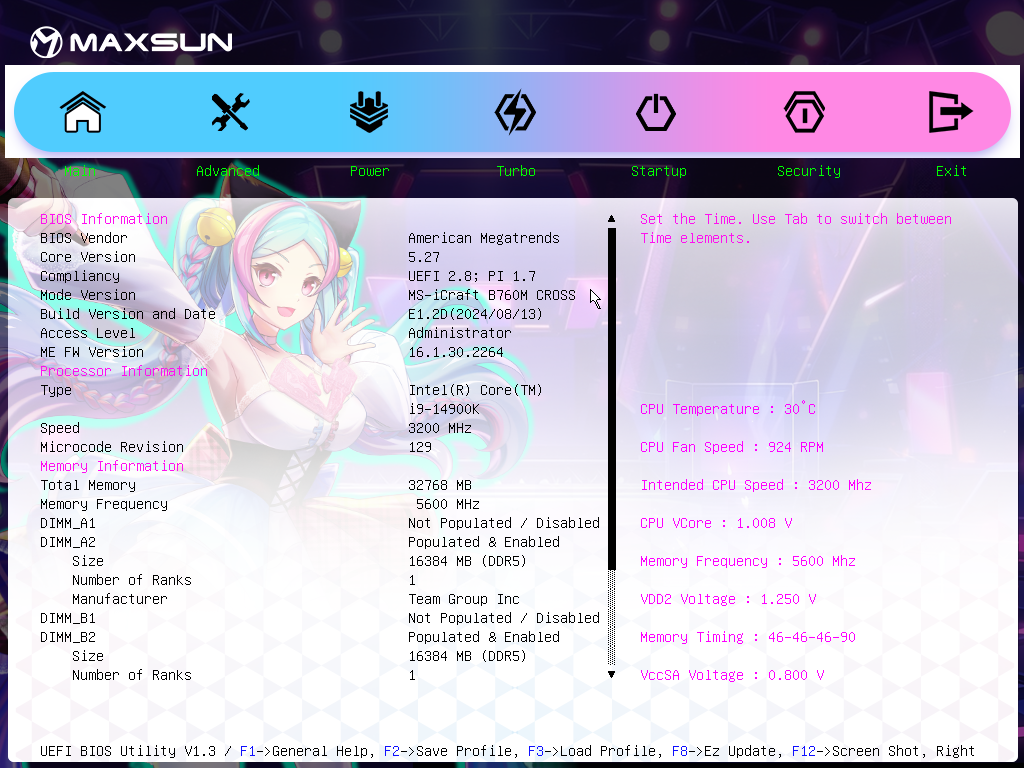 Для установки модулей памяти на плате Maxsun имеется четыре DIMM-слота (для работы памяти в Dual Channel в случае использования всего 2 модулей их следует устанавливать в А2 и B2 (черного цвета). Плата поддерживает небуферизованную память DDR5 (non-EСС), а максимальный объем памяти составляет 192 ГБ. Поддерживаются профили XMP.