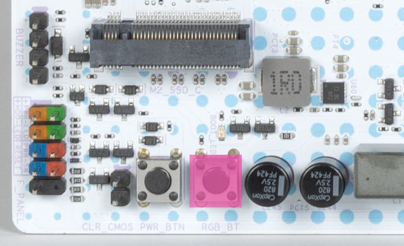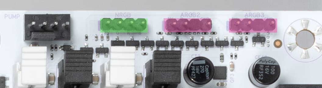 Также материнская плата имеет 3 разъема для подключения внешней ARGB/RGB подсветки: 2 разъема для подключения адресуемых (5 B 3 A, до 15 Вт) ARGB-лент/устройств и 1 разъем неадресуемых (12 В 3 А, до 36 Вт) RGB-лент/устройств. Разъемы расположены на верхнем торце платы.