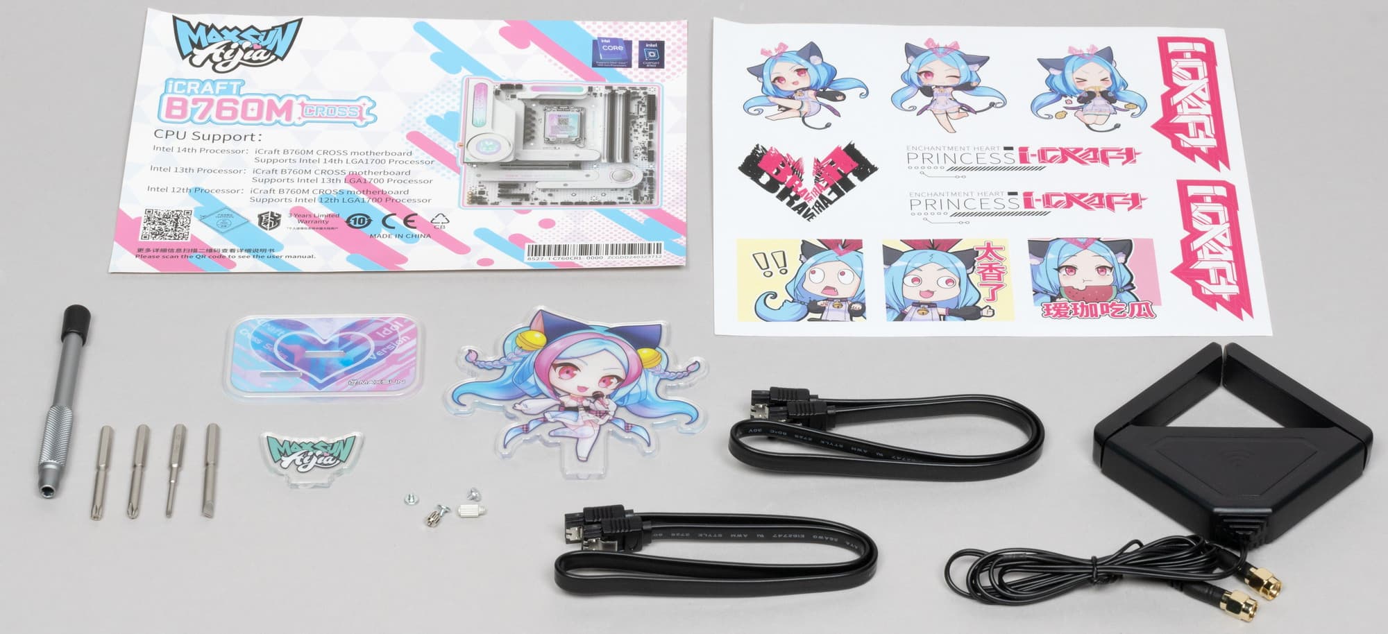Комплект поставки имеет все привычные элементы, свойственные бюджетным матплами: руководство пользователя (в виде карточки с QR-кодом, по которому можно скачать электронную версию мануала), кабели SATA, антенна встроенного Wi-Fi-модуля, винтики для М.2 слотов. При этом еще имеются и бонусы: стикеры, фигурка-статуэтка Aijia (с подставкой) и отвертка с несколькими насадками.