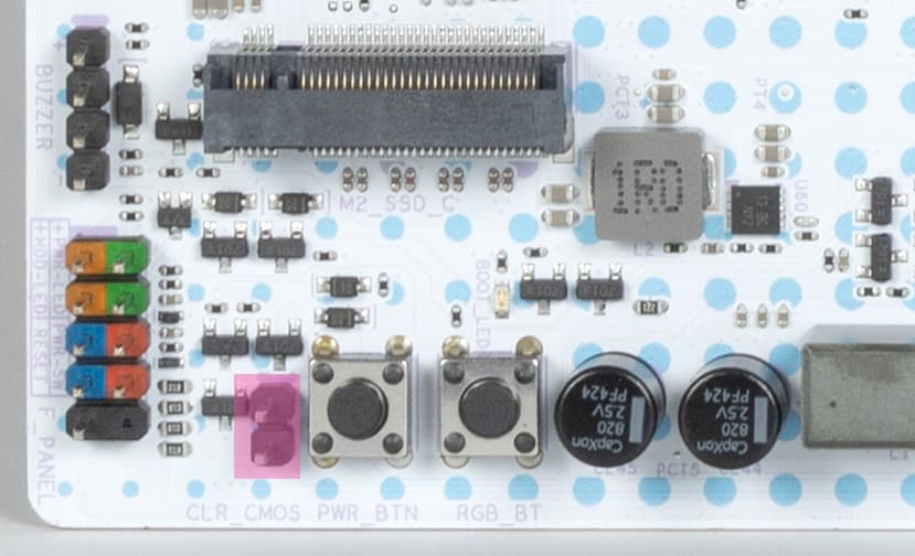 Во-третьих, перемычка сброса CMOS. Также сбросить данные можно и с помощью кнопки на задней стороне.