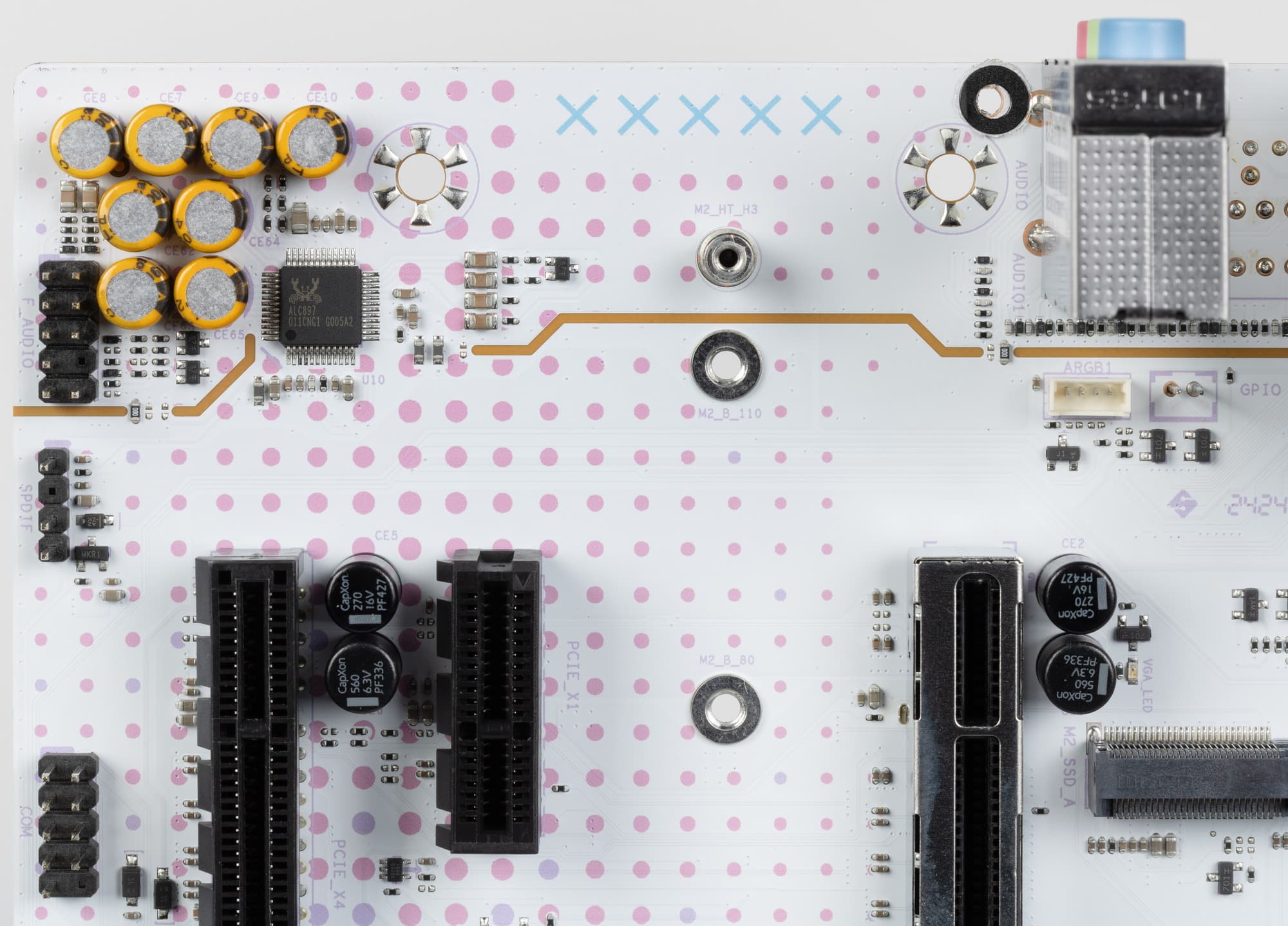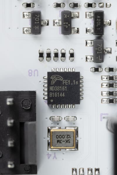В аудиоцепях платы применяются «аудиофильские» конденсаторы Nichicon Fine Gold.