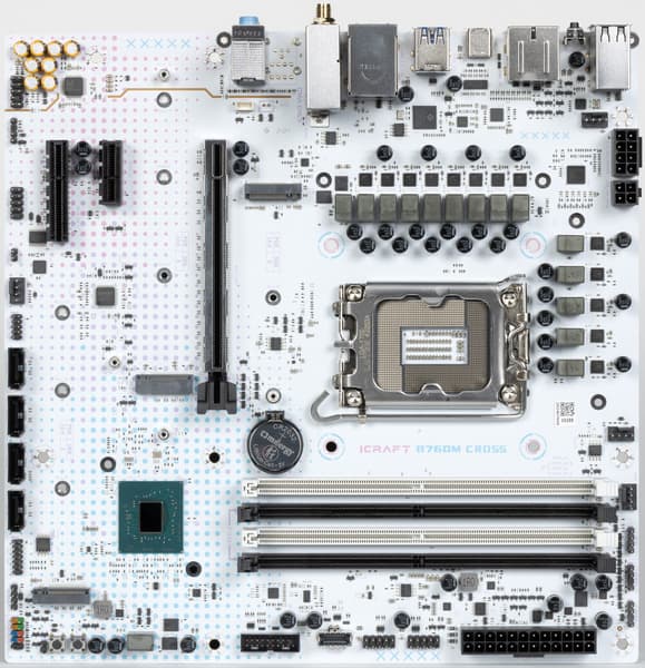 Форм-фактор Micro-ATX имеет размеры 244×244 мм, ATX до 305×244 мм, а E-ATX — до 305×330 мм. Материнская плата Maxsun iCraft B760M Cross выполнена в форм-факторе Micro-ATX, имеет размеры 244×244 мм, и на ней имеются 8 монтажных отверстий для установки в корпус.