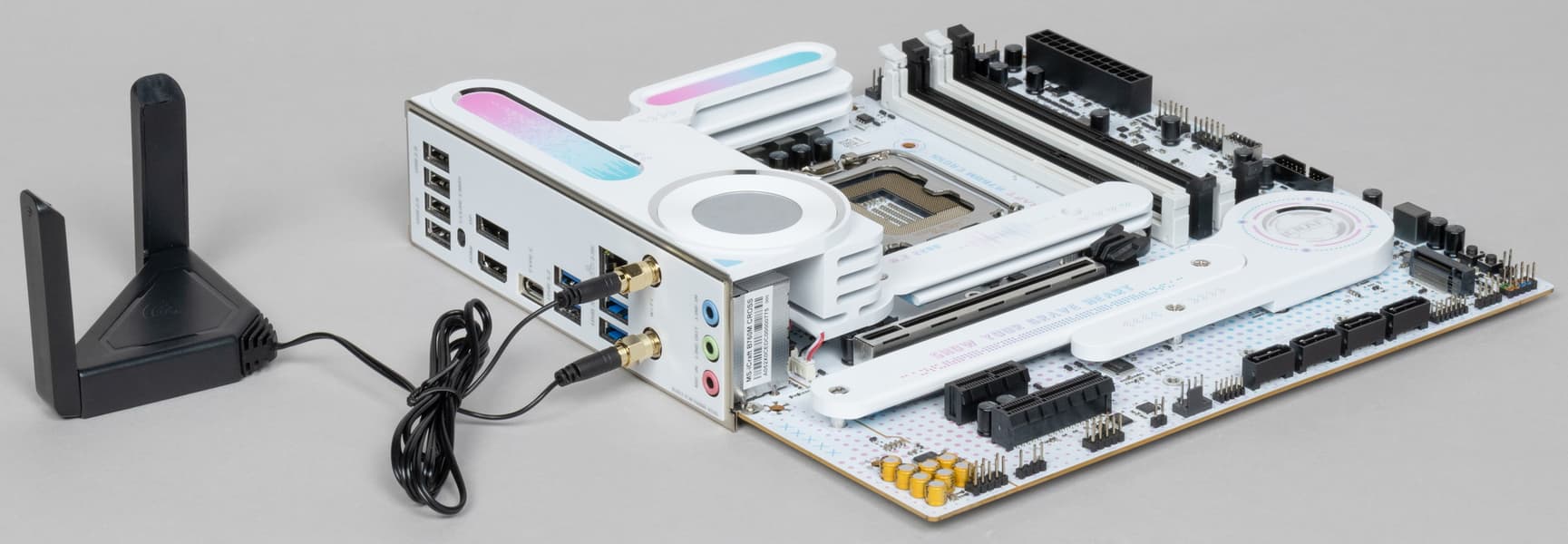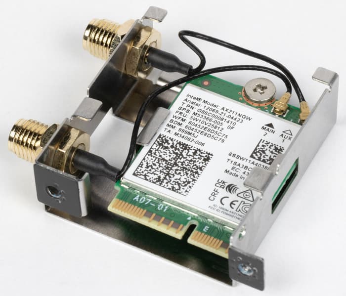 Имеется и комплексный беспроводной адаптер на контроллере Intel AX-211NGW, через который реализованы Wi-Fi 6 (802.11a/b/g/n/ac/ax) и Bluetooth 5.2. Он установлен в слот M.2 (E-key), и его разъемы для привинчивания выносных антенн выведены на заднюю панель.