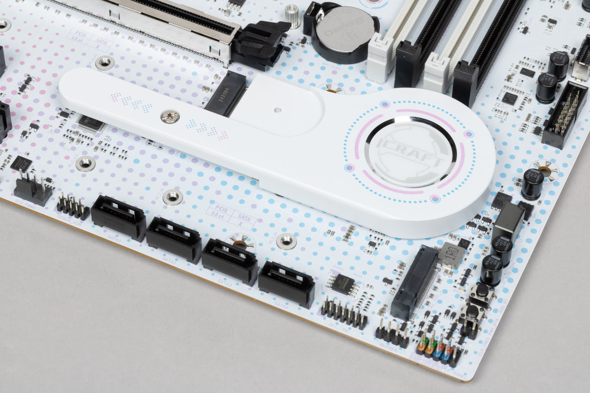 Дизайнеры Maxsun себе верны: если уж выбрали девочку в качестве символа серии, то и дизайн самой платы должен быть «мимимишным», мы видим и белый в мелкую точку окрас текстолита, и симпатичные радиаторы округлых форм. Не хватает лишь стразов или чего-то подобного блестящего. -)