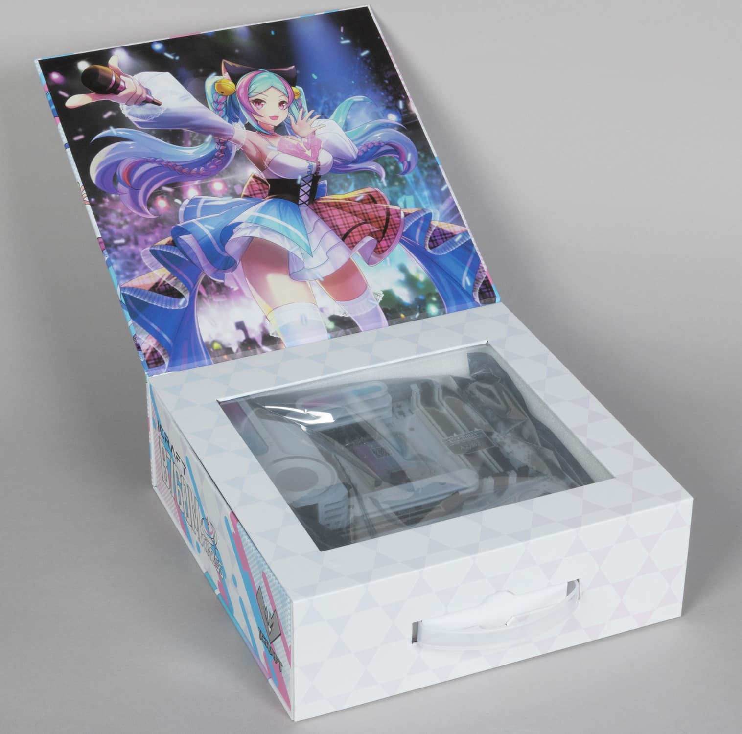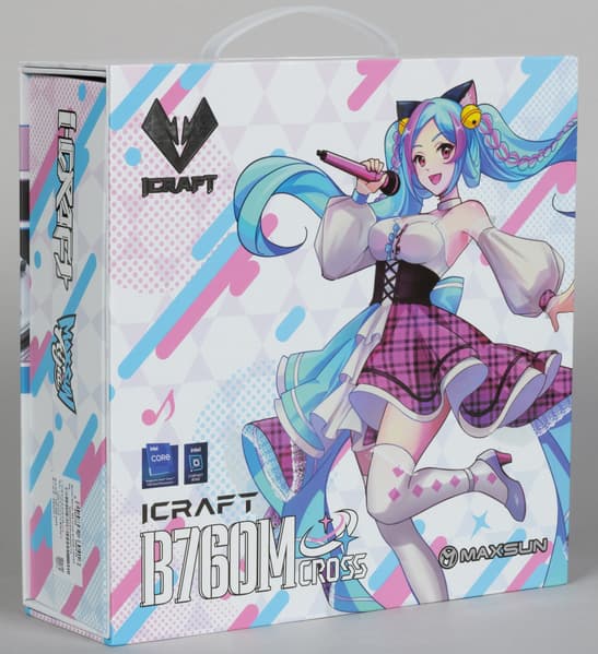 Итак, Maxsun iCraft B760M Cross поставляется в большой коробке яркого дизайна. Комплект размещен под платой в отдельном отсеке. Коробка имеет откидывающуюся крышку, разумеется, с главной героиней серии.