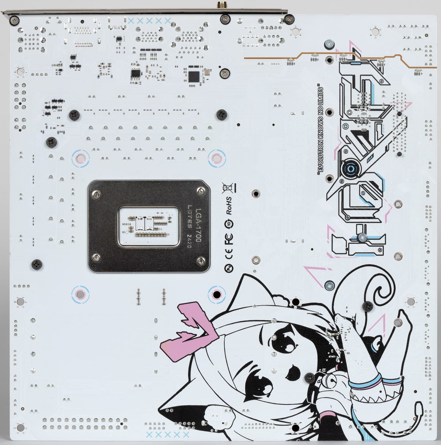 Оборотная сторона — почти пустая, там расположен лишь один контроллер. Текстолит обработан хорошо: во всех точках пайки острые концы срезаны. Несмотря на то, что задняя сторона платы будет видна лишь в моменты вынимания платы из коробки и до ее установки в корпус, художники Maxsun и здесь сотворили целую картинку. А главное-то: весьма значимый лозунг «Эволюция не имеет границ» размещен.. также на тыльной стороне платы. -)