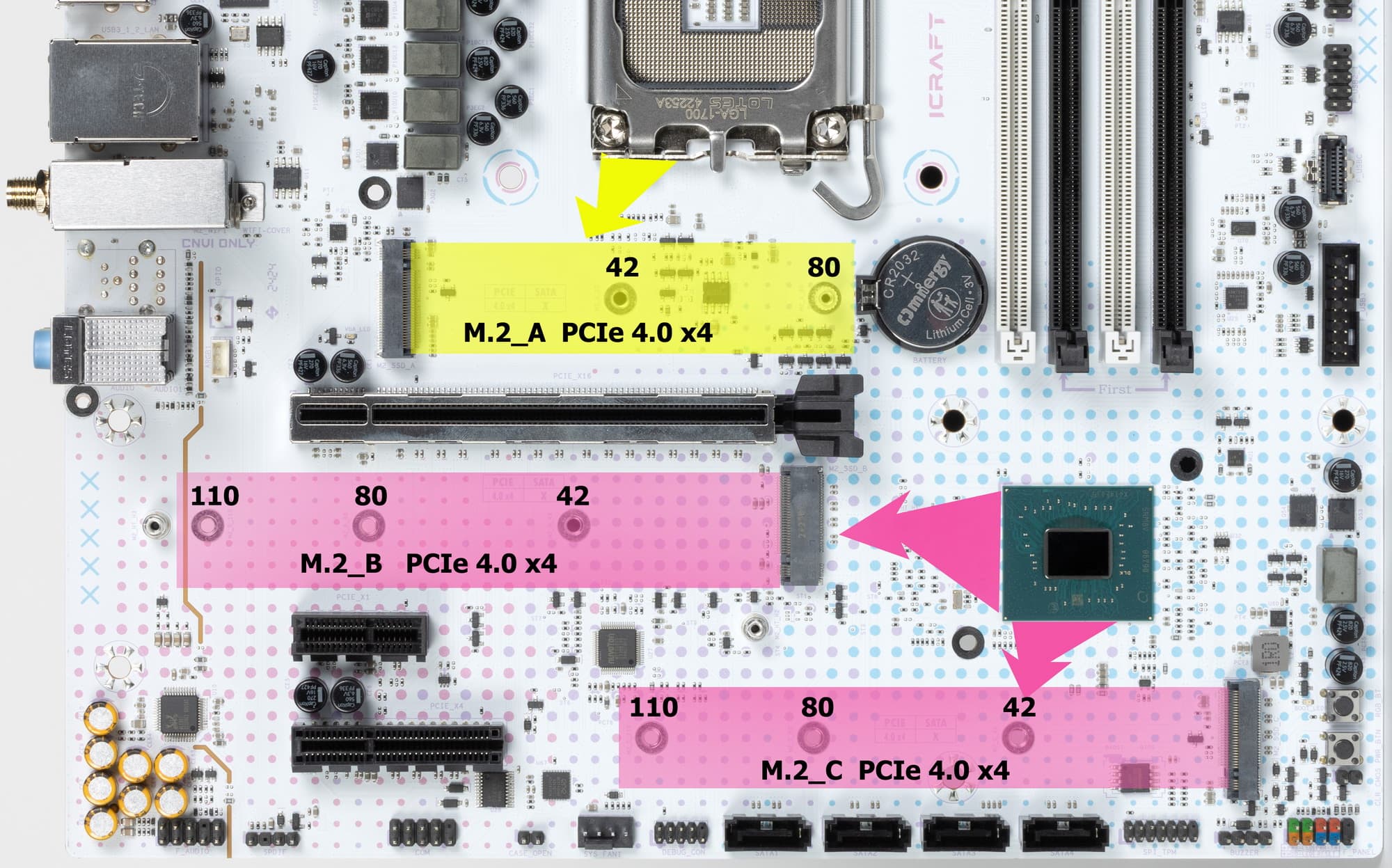 Второй M.2_B и третий M.2_C получают данные от чипсета B760, поддерживая PCIe 4.0, а также размер модулей 22110 . Первый M.2_A получает данные от CPU (PCIe 4.0). На всех M.2 можно организовать RAID.