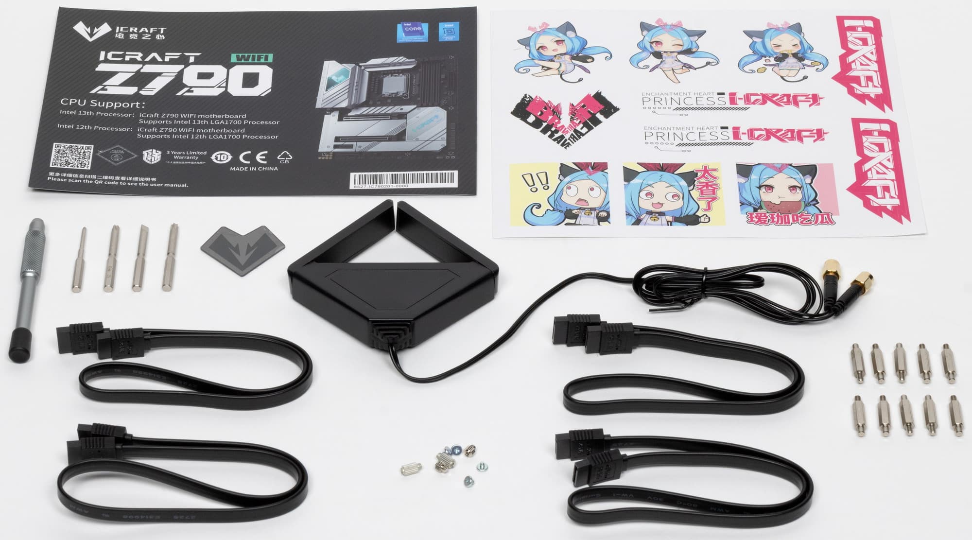 Maxsun iCraft Z790 WiFi поставляется в красивой и дорогой упаковке из плотного картона с крышкой на магнитном замке и ручкой для переноски. Комплект размещен под платой в отдельном отсеке.