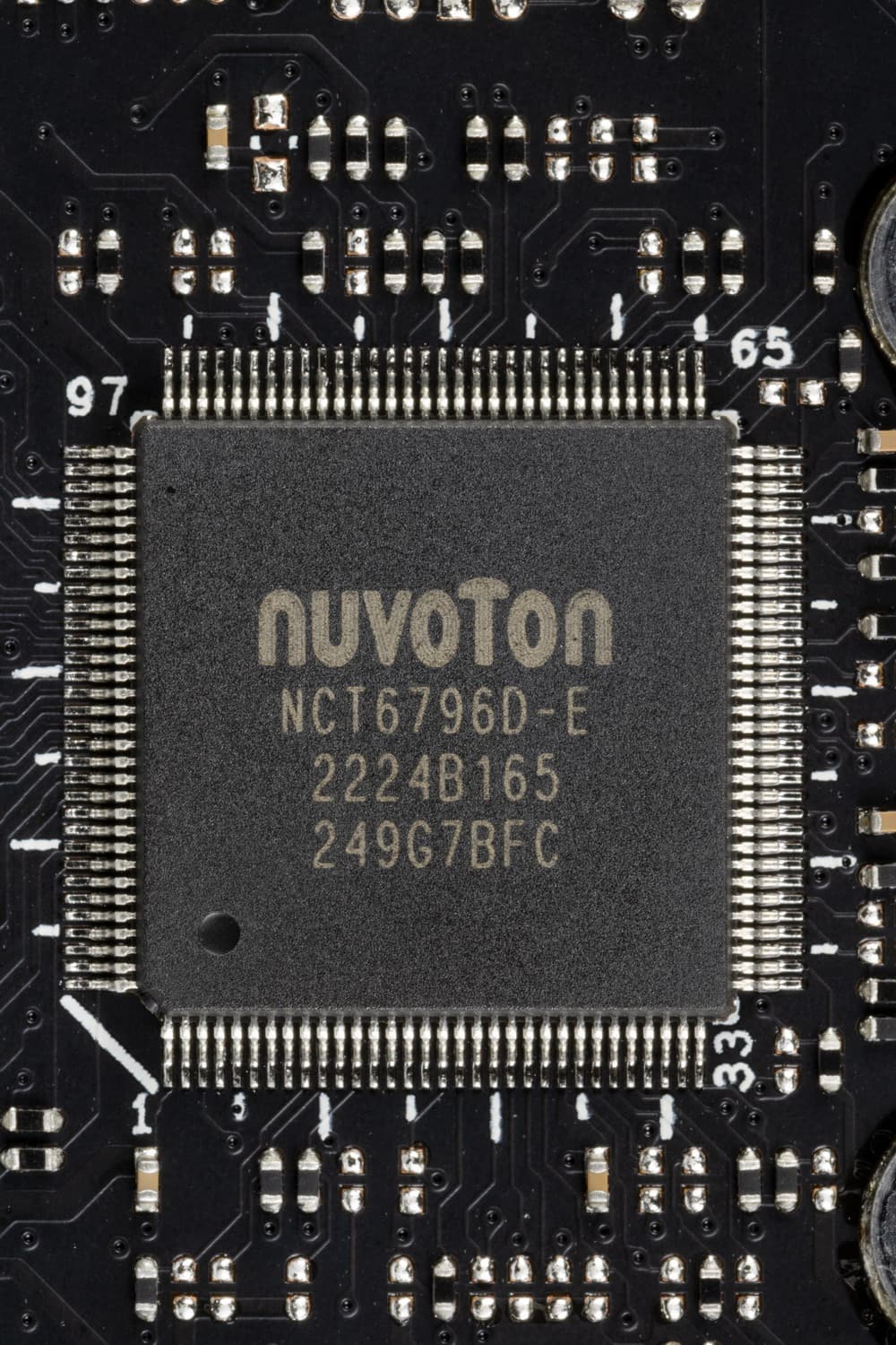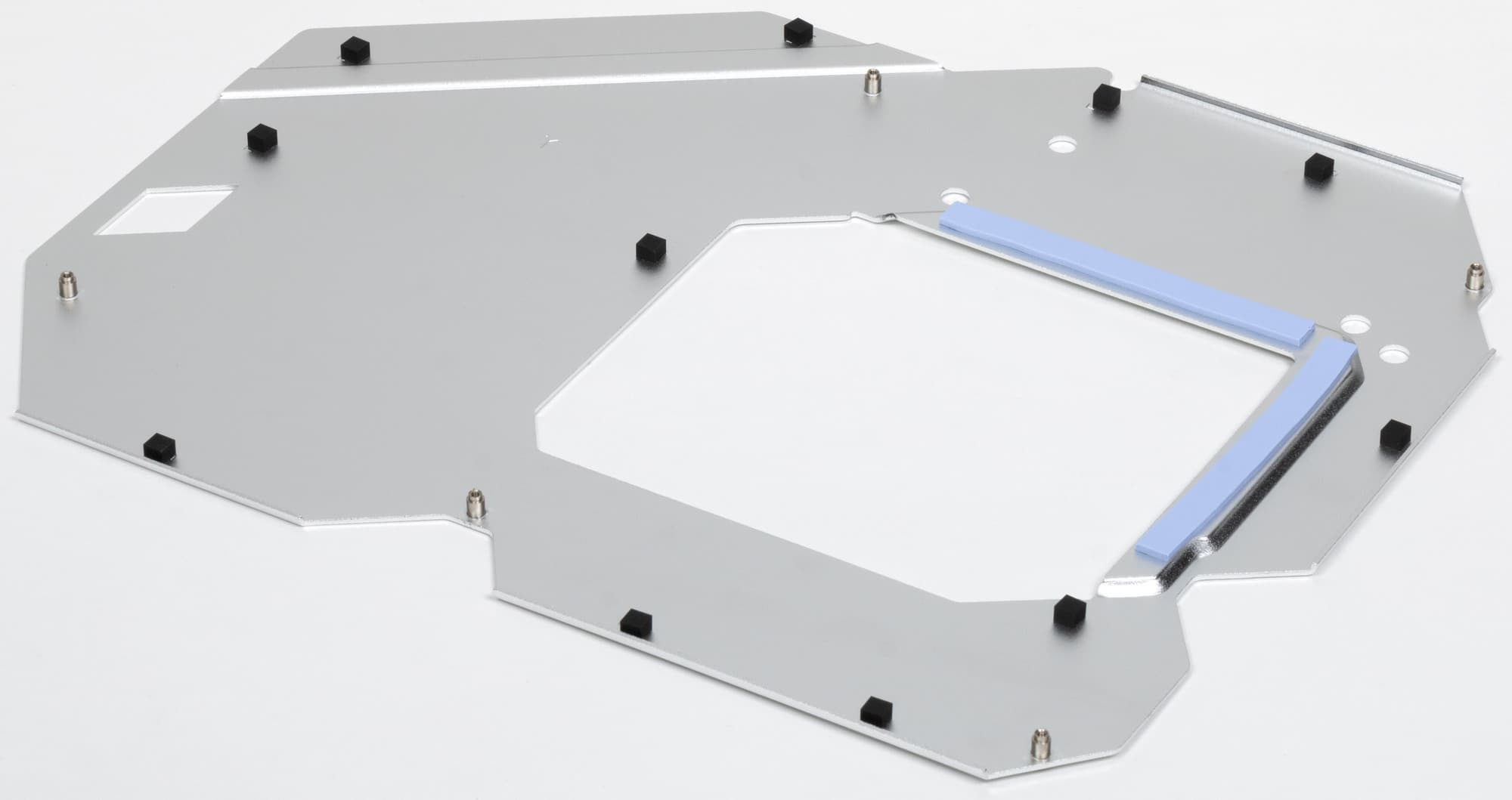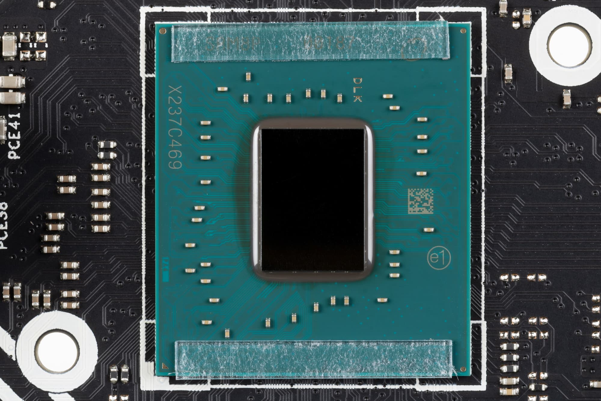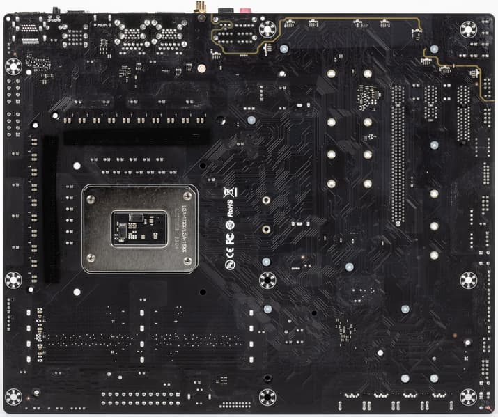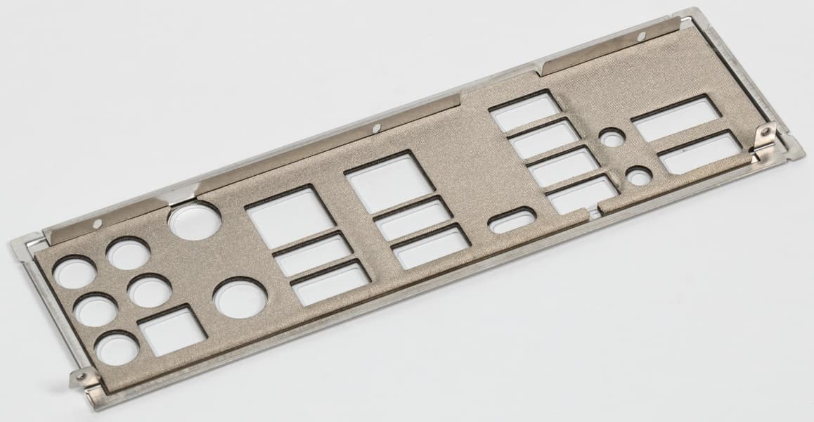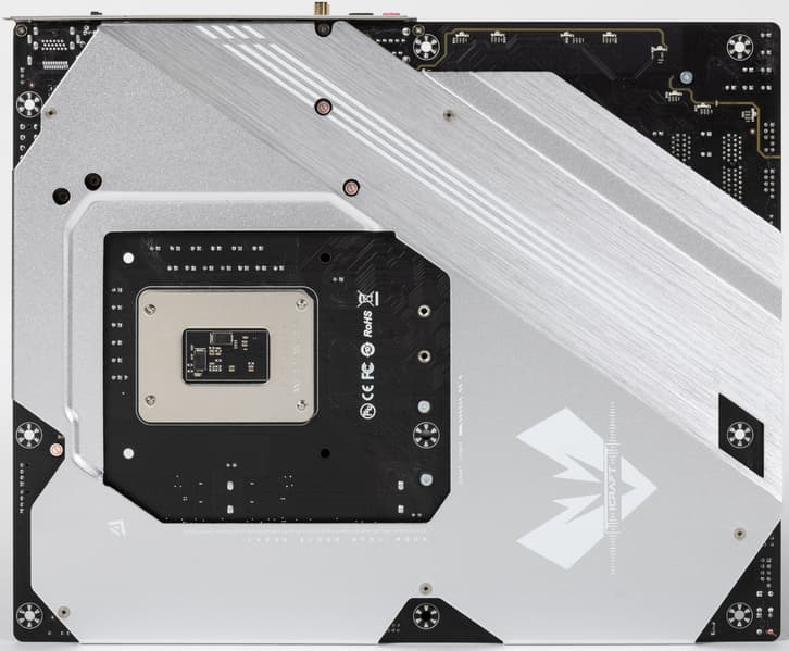 Материнская плата имеет бэкплейт, эта задняя пластина не только защищает PCB от повреждений, но и участвует в охлаждении через термоинтерфейс с оборотной стороны платы в области преобразователей питания VRM.
