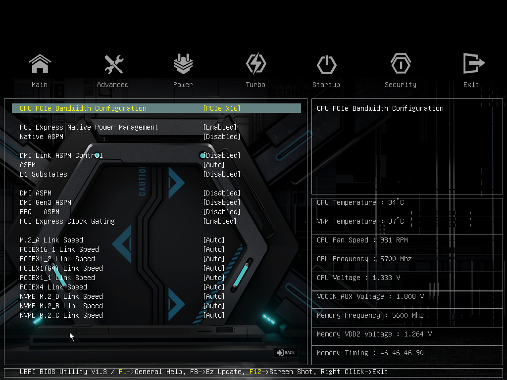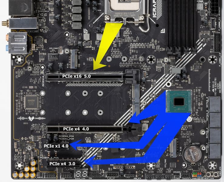 Теперь посмотрим выше на то, как работают процессоры в данной конфигурации. У CPU 12/13/14-го поколений всего 20 линий PCIe, 4 из них версии PCIe 4.0 отведены на порт М.2 (M.2_2). Оставшиеся 16 линий PCIe 5.0 идут на слот PCIe x16_1, так что вариантов переключений нет.
