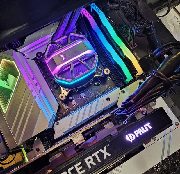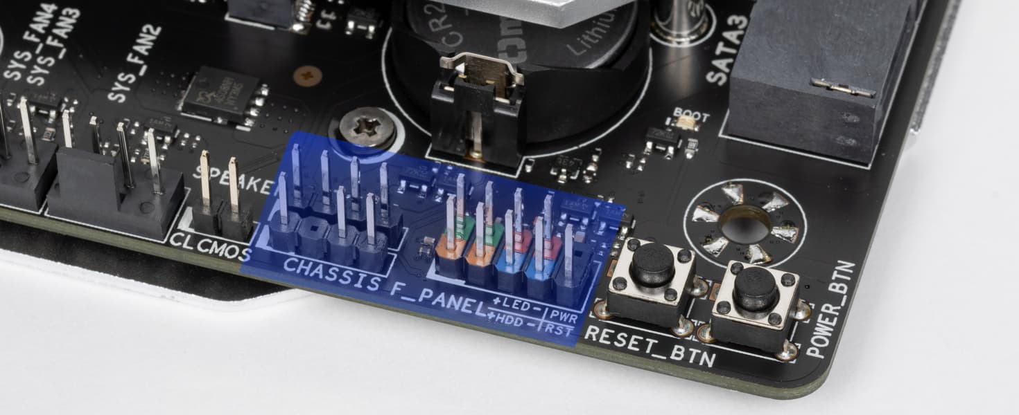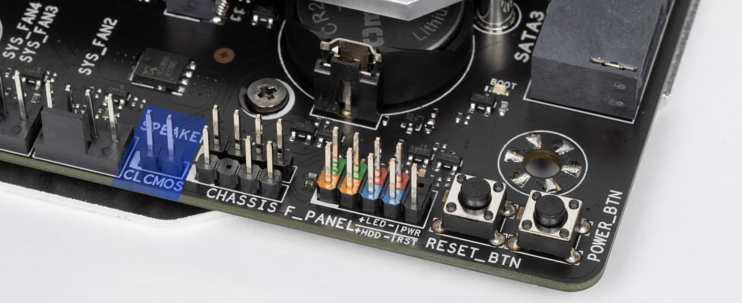 | Прочие внутренние элементы | 24-контактный разъем питания ATX 2 8-контактный разъем питания EPS12V 1 слот M.2 (E-key), занят адаптером беспроводных сетей 1 разъем для подключения порта USB 3.2 Gen2x2 Type-C 1 разъем для подключения 2 портов USB 3.2 Gen1 2 разъема для подключения 3 портов USB 2.0 6 разъемов для подключения 4-контактных вентиляторов и помп ЖСО 1 разъем для подключения неадресуемой RGB-ленты 2 разъема для подключения адресуемой ARGB-ленты 1 разъем аудио для передней панели корпуса 1 разъем для устройств безопасности TPM 1 разъем COM-порта 1 кнопка включения 1 кнопка перезагрузки 1 кнопка включения/отключения подсветки 2 разъема для подключения управления с передней панели корпуса 1 разъем сброса CMOS |