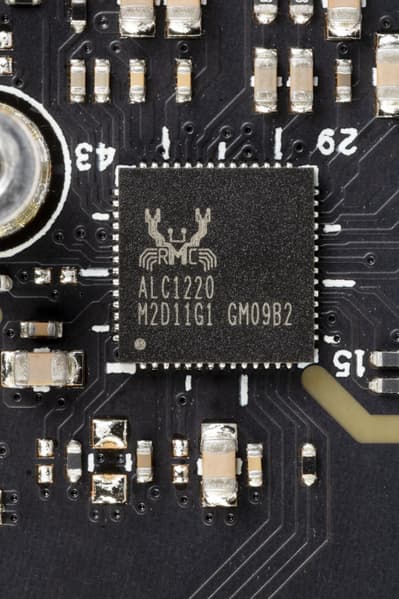 Для относительно простой материнской платы производитель выбрал уже давно всем известный и популярный кодек Realtek ALC1220. Он в целом обеспечивает вывод звука по схемам до 7.1 с разрешением до 24 бит / 192 кГц.